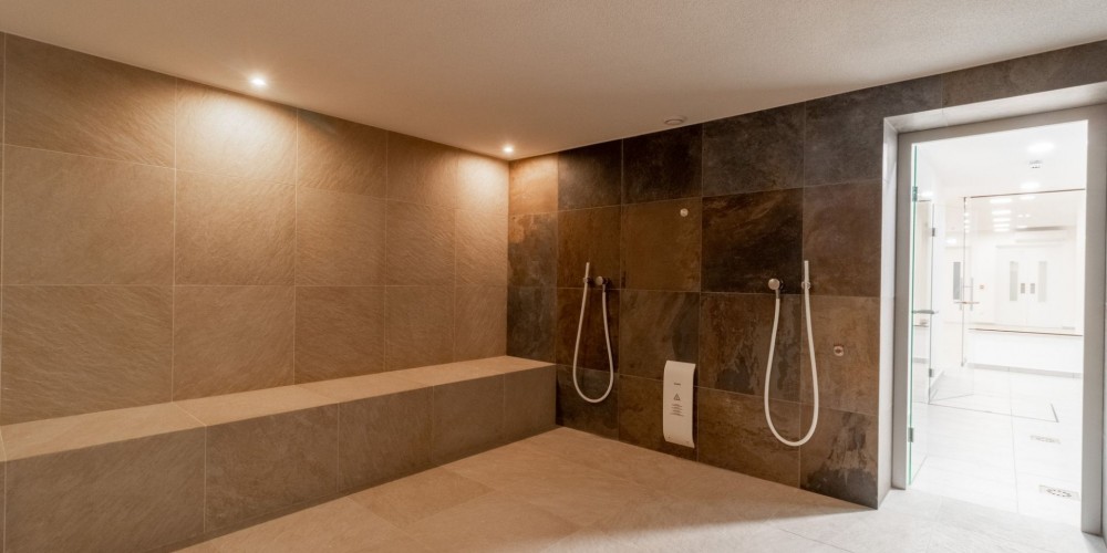 - Bathroom floors and walls are laid with expensive sorts of marble and granites