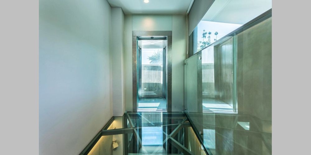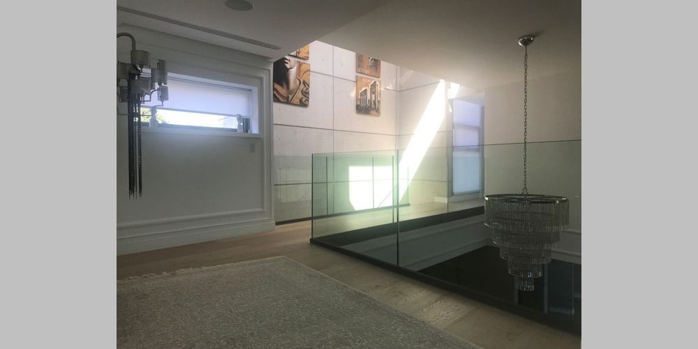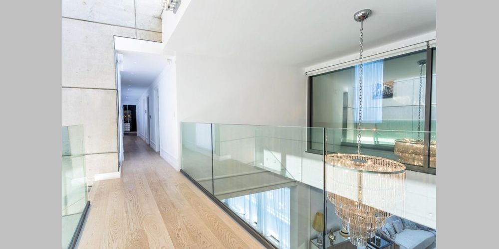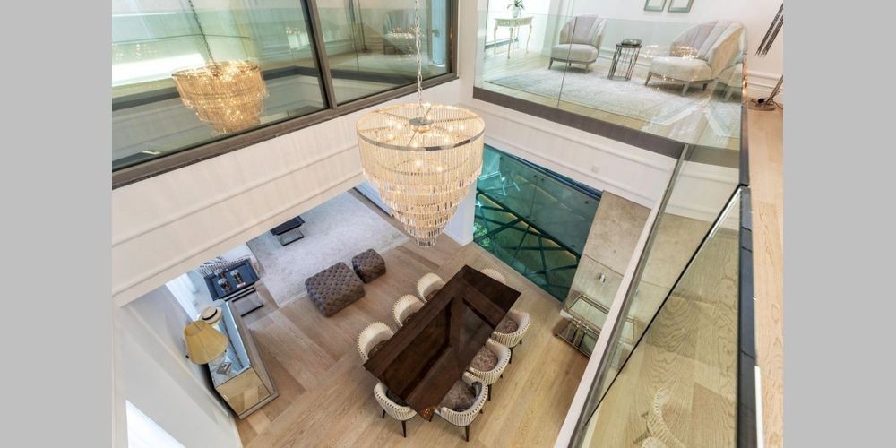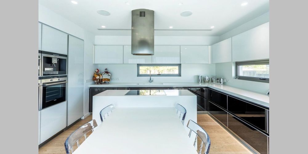 First floor: Main living room with panoramic sea views from all floor to ceiling windows with fire place, family kitchen with the door, leading to huge covered garage.