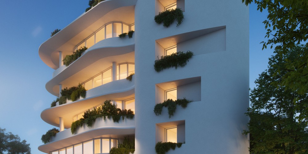The curved architecture of the building creates a sense of space, openness and light. This feature is emphasized by attractive open verandas on each floor with views of the cityscape. The building is located at the entrance to Paphos, close to the highway in a busy area.
