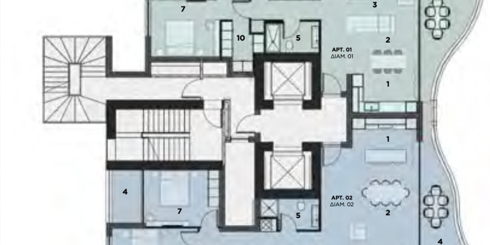 The building boasts a pure white façade, while the intertwined, organically curved balconies offer striking, uninterrupted views of the Old City behind the Venetian walls and the surrounding Pentadactylos Mountain beyond. The uniquely designed balconies take advantage of sunlight while creating a staggered arrangement of living spaces to enhance privacy.