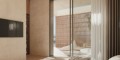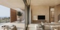 The soft natural colors of the exterior, accentuated yet softened by the use of terra cotta screens and natural wood paneling, flow seamlessly into the interior living space, which transitions to a spacious outdoor living area. The exterior color scheme and use of wood continues inside with soft sand colored walls and ceilings highlighted by walnut doors and soft, warm downlights that are unobtrusive yet effective in creating a homey feel on winter nights. Inside, the sense of luxury is enhanced by travertine marble slabs used in the bathrooms and as headboards in the bedrooms.