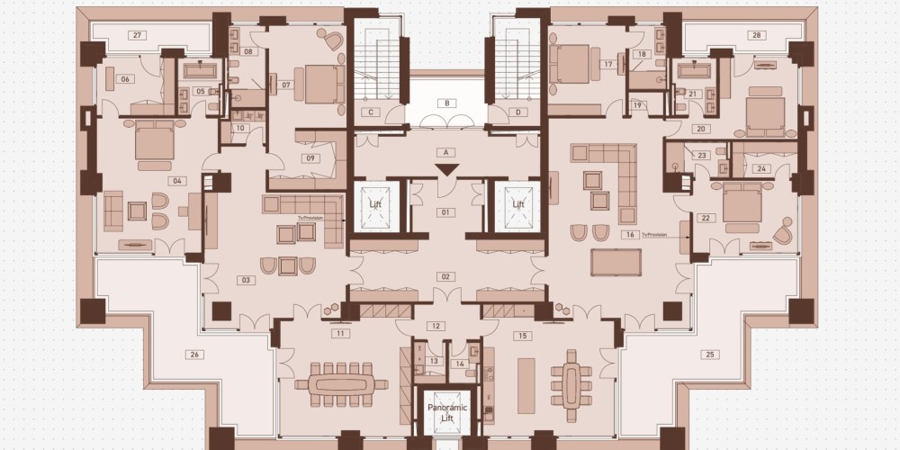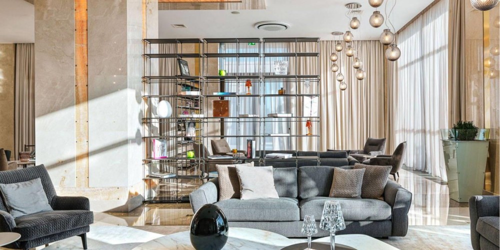 The timeless elegance and durability of the stone façade create an atmosphere of comfort and luxury in this residential complex. The spacious lobby, covering 700 m² and featuring a 70 m² open veranda, offers a lounge area with a piano and a fireplace, a meeting room, and a wine cellar, making it the perfect venue for private gatherings and events. Residents enjoy exceptional services, including concierge assistance, professional property management, and 24/7 security.