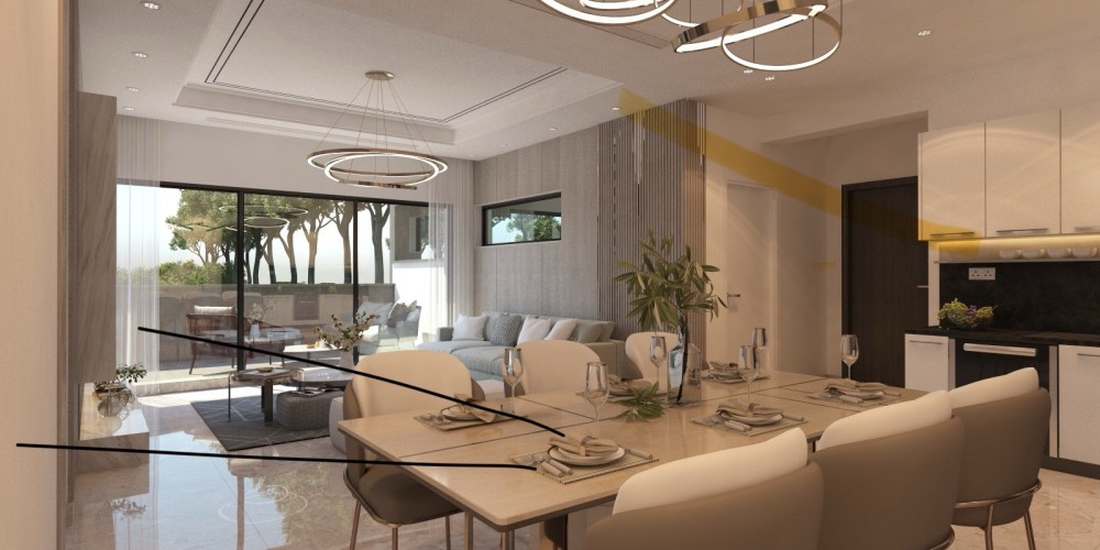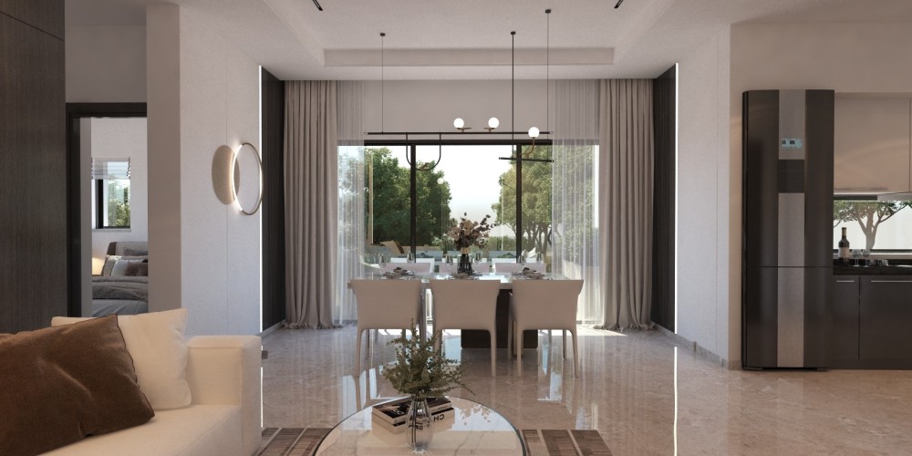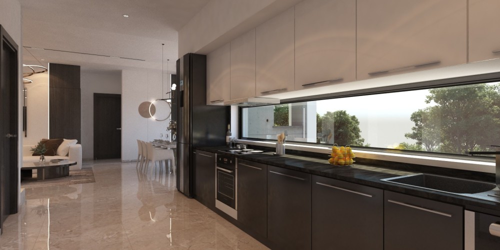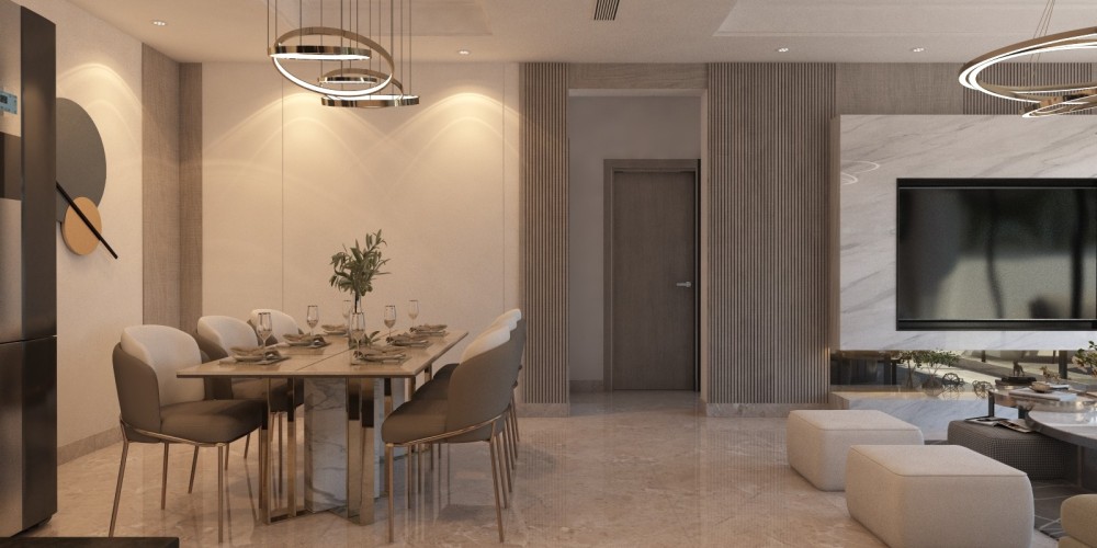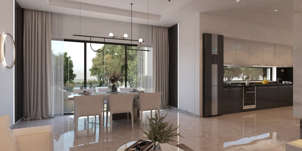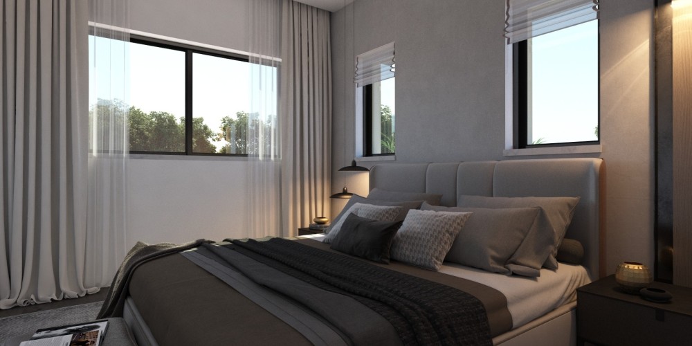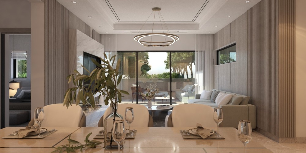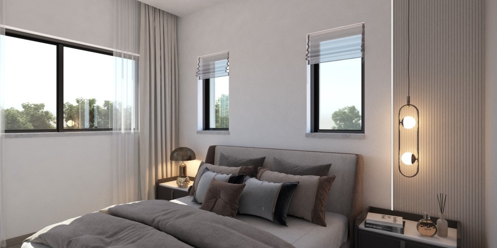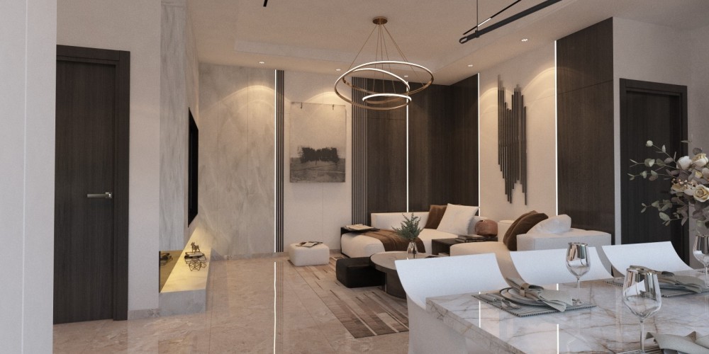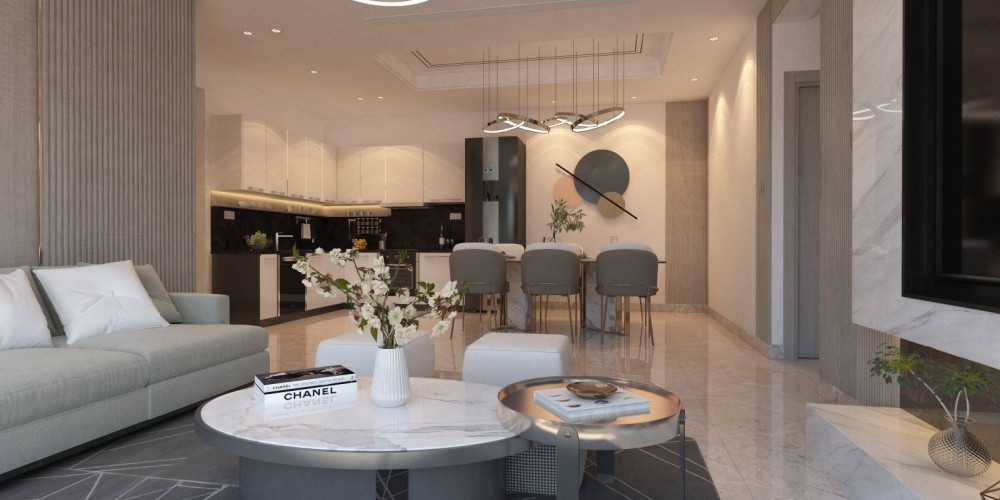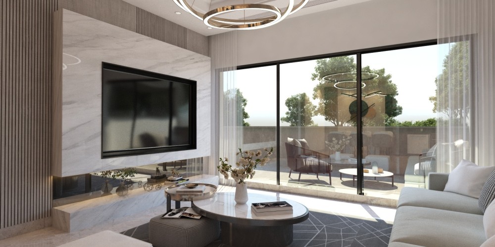 This development boasts a luxurious design with modern technologies, eco-friendly materials, and elegant interiors in soft grays and whites. High ceilings, panoramic windows, and sophisticated lighting enhance the spaciousness and ambiance.