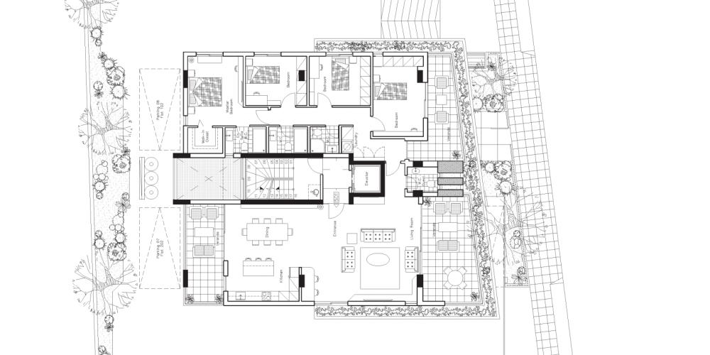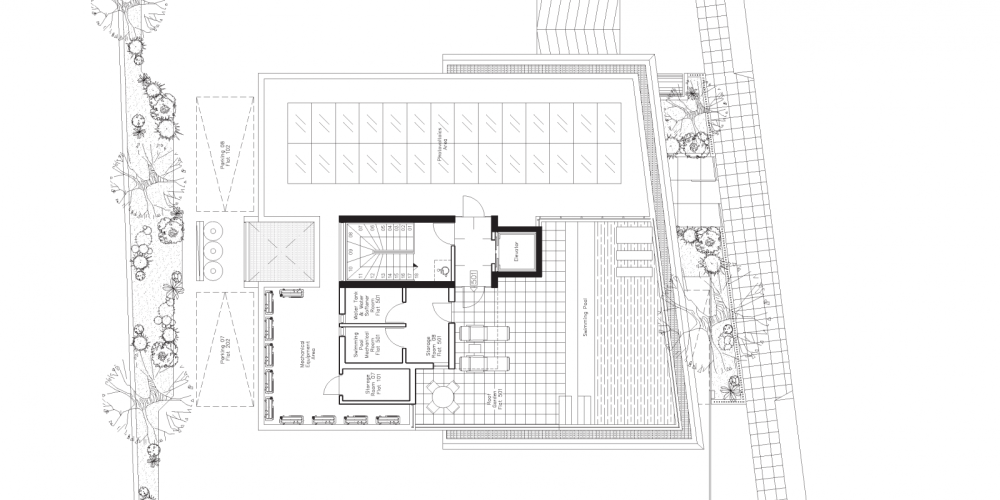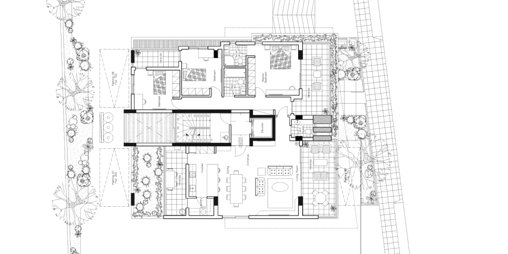 Residents benefit from a range of amenities, including underfloor heating, VRV air conditioning, a burglar alarm, home automation, and a lighting and shades control system. Kitchens and cupboards are sourced from Europe, ensuring quality craftsmanship. Each unit has a designated covered parking space and a storage room. The top-floor penthouse features a spacious terrace garden and a swimming pool.
