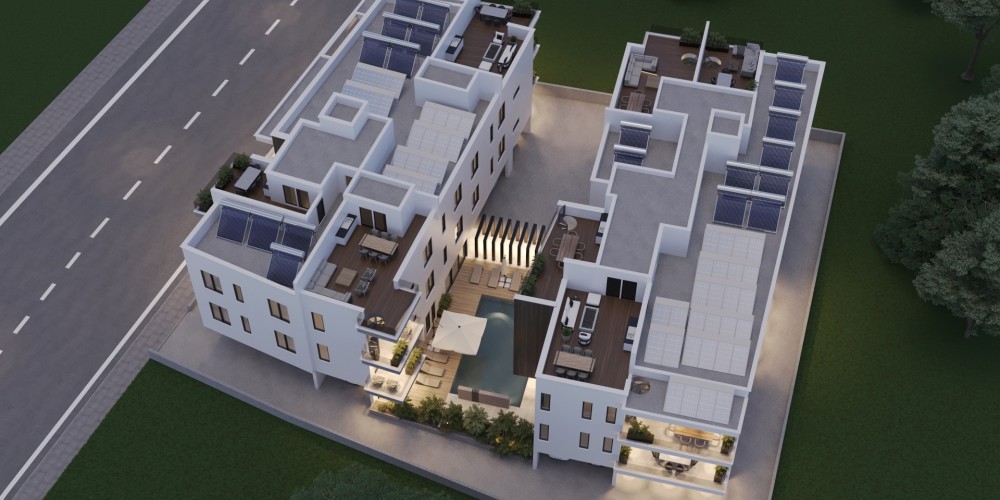 This new residential project in Livadia, Larnaca, offers a range of one- and two-bedroom apartments designed for comfortable living. The development features a gated community with modern amenities, including a swimming pool, fitness center, landscaped gardens, and a lounge area. Each unit is built with advanced thermal insulation and an eco-friendly solar system, ensuring energy efficiency.