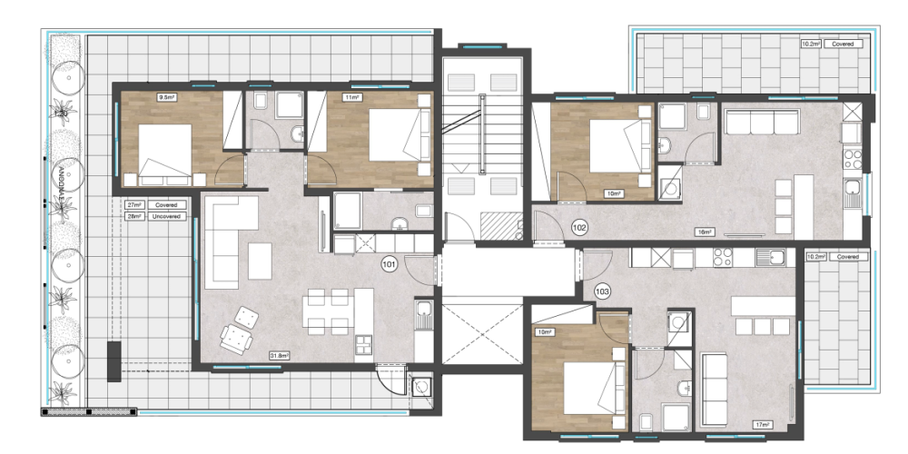 - Two penthouse units, one of which features a private roof garden, offering panoramic views and additional outdoor space.