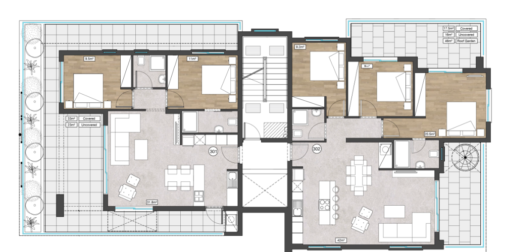 - Two penthouse units, one with a private roof garden