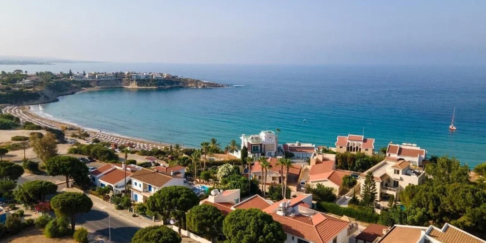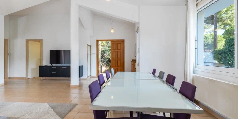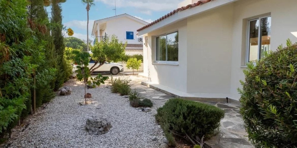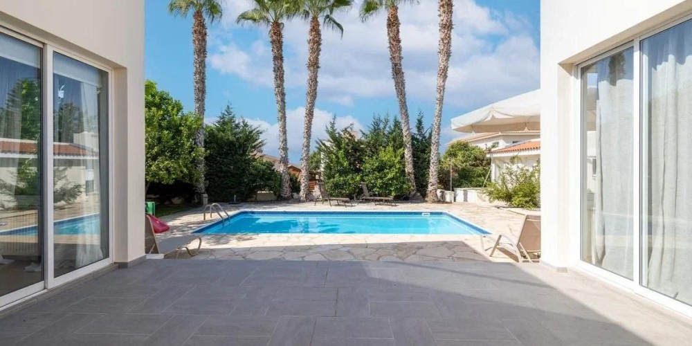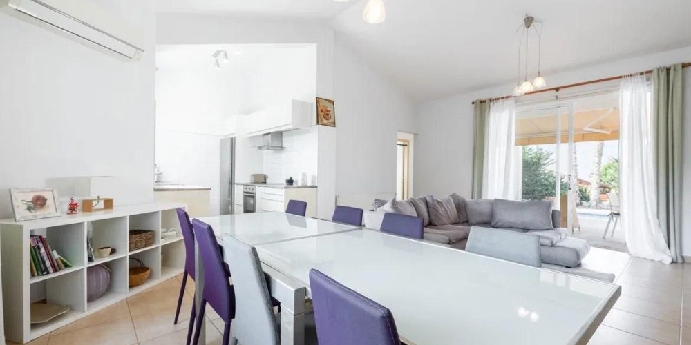 Located just 100 meters from the sandy shores of Coral Bay in Paphos, this single-storey villa offers relaxed coastal living in one of the area's most sought-after seaside resorts. Set on a 650 m² plot, the bungalow features four bedrooms and two bathrooms, with an open plan layout that connects the kitchen, living, and dining areas into a bright and airy space. Two of the bedrooms open directly onto the pool area, inviting a seamless indoor-outdoor lifestyle.