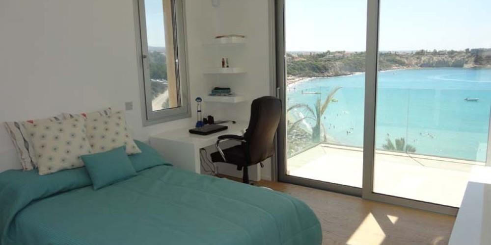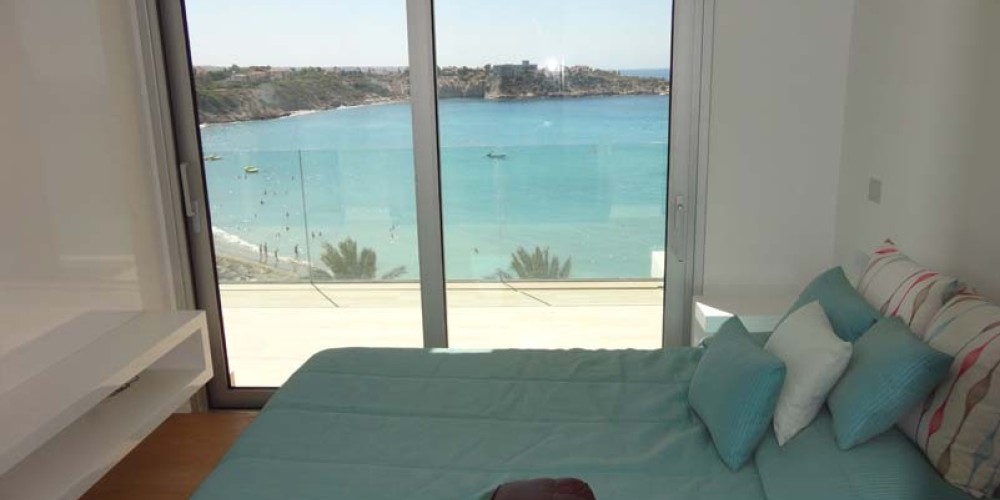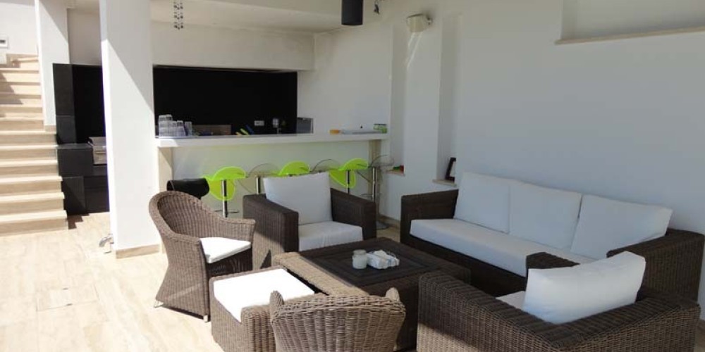 The upper level includes four bedrooms, all with en-suite bathrooms and private balconies. The master suite features its own sea-facing terrace. Accessible via staircase or elevator, the rooftop terrace includes a bar area and marble seating, offering panoramic views of the coastline.