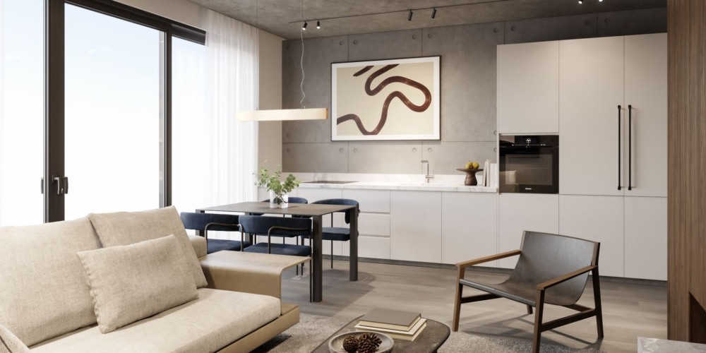 Though located in a lively part of the city, the apartments are designed to provide a quiet and comfortable retreat. The rooftop level offers a swimming pool and a casual café area, while a bakery and restaurant on-site add to the lifestyle offering.