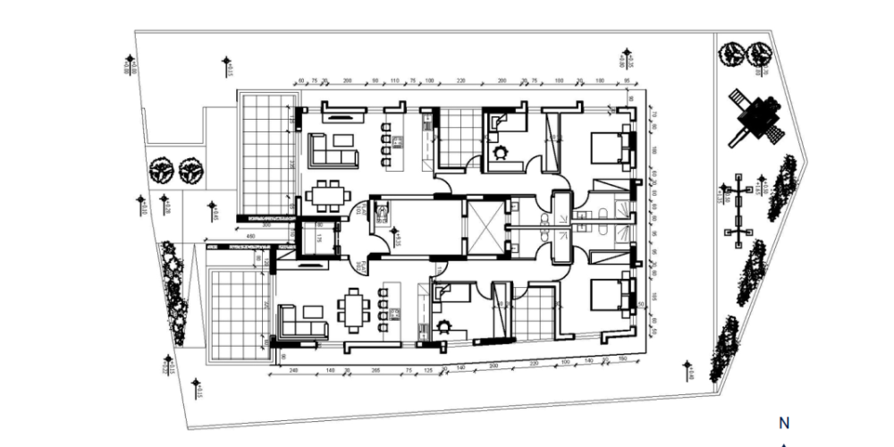 The development consists of eight residential units, including 2-bedroom apartments and 2-bedroom penthouses. Each unit is designed with open-plan interiors, providing functional living, kitchen, and dining areas. Private verandas extend the living space outdoors.