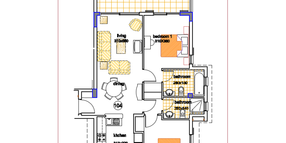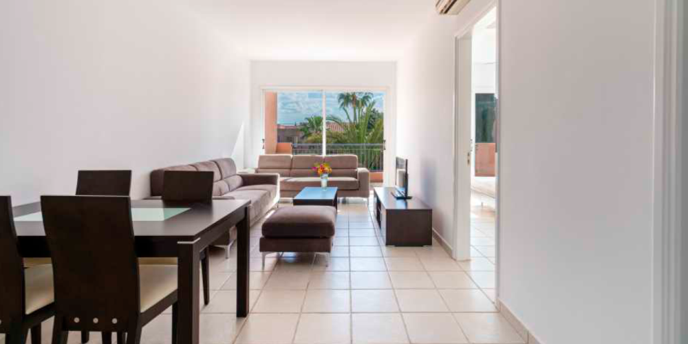 This first floor apartment is part of a seafront residential project offering a variety of unit types, including one- and two-bedroom apartments, penthouses, and detached villas with three bedrooms. The apartment includes a living room, dining area, kitchen, two bedrooms, and two bathrooms, designed for comfortable everyday use.