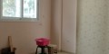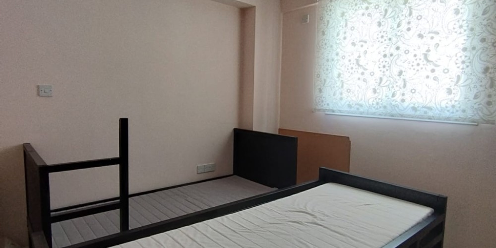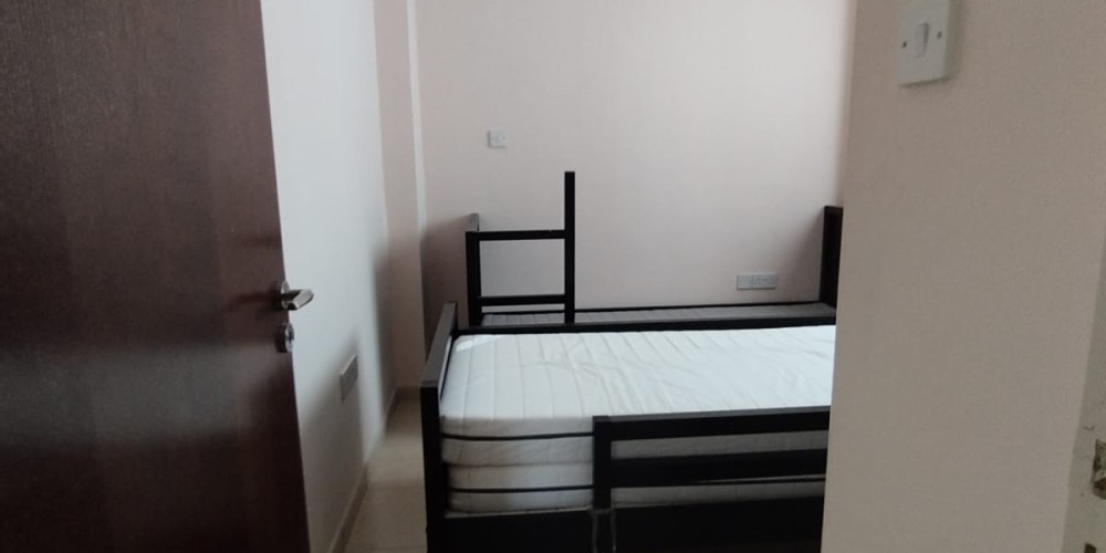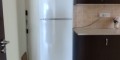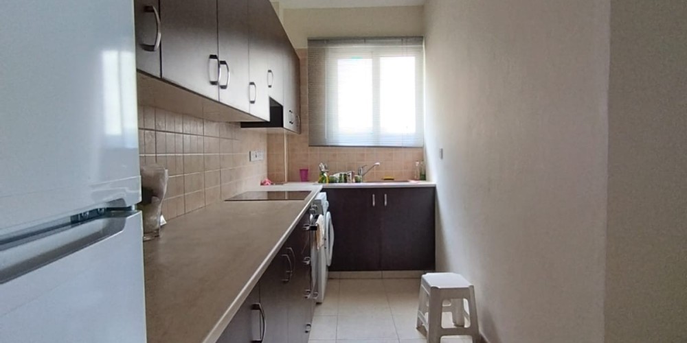 The apartment offers a practical layout with a separate kitchen, a spacious living and dining area, two bedrooms, and a bathroom. The kitchen is designed in a galley style with built-in cabinets and appliances. The living room opens onto a covered balcony, allowing for natural light and ventilation. Both bedrooms include built-in wardrobes, and there is split-unit air conditioning in the main areas.