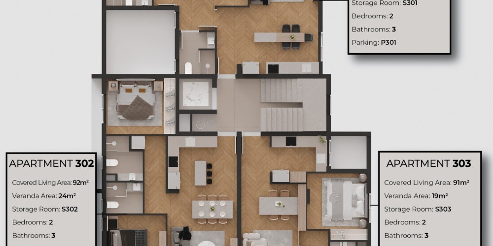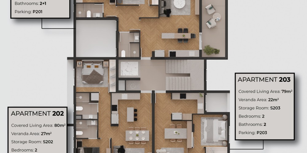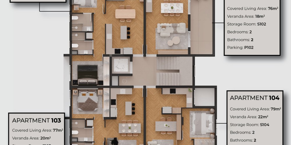 Each apartment comes with private covered parking and a dedicated storage room. The building is constructed in accordance with modern standards and holds an Energy Performance Certificate with an “A” rating.