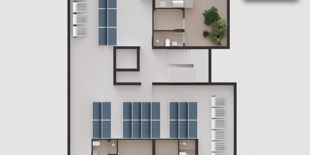 The development consists of ten two-bedroom apartments distributed across three floors. The first floor includes four units, while the second and third floors feature three units each. Top-floor apartments include an additional room, a second bathroom, and access to a private roof garden.