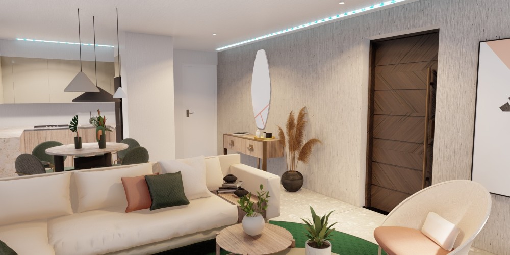 The apartment is thoughtfully designed for energy-efficient living, including photovoltaic systems and water-based underfloor heating powered by a heat pump. Two dedicated covered parking spaces are included.
