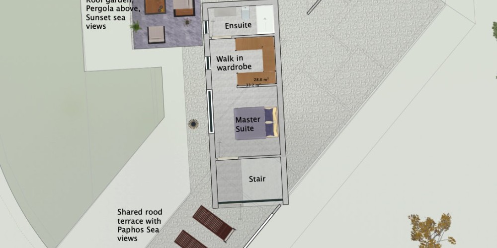 This secluded property is located near Sea Caves, Coral Bay, and Peyia in Kato Paphos. The main house includes three bedrooms, an open-plan living, dining, and kitchen area, and a separate multi-use room that can serve as a fourth bedroom, office, gym, or additional living space. The property sits on a 980m² plot with extensive gardens, a pool with a shallow section and sunken seating, a BBQ area, and a large roof terrace offering sunset sea views. A self-contained one-bedroom apartment is also included.