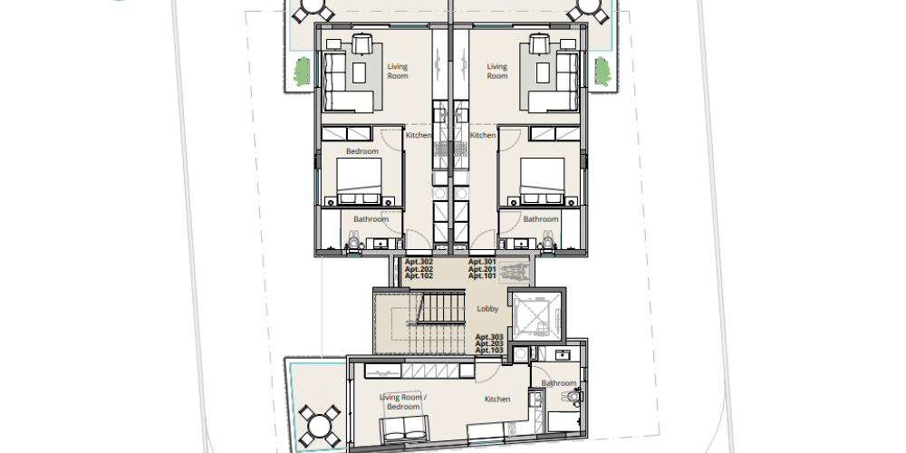 In addition to the one-bedroom units, the second and third floors also include a studio apartment per floor. Each studio offers a compact layout with a combined living, dining, and sleeping area, a modern kitchenette, a separate bathroom, and access to a balcony for outdoor relaxation.