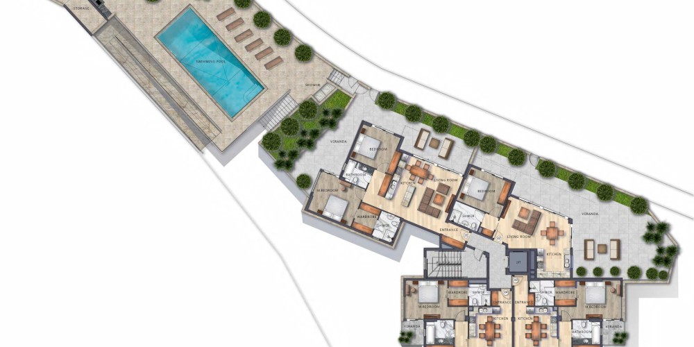 - Ground floor with shared pool, BBQ area, storage rooms, and covered parking