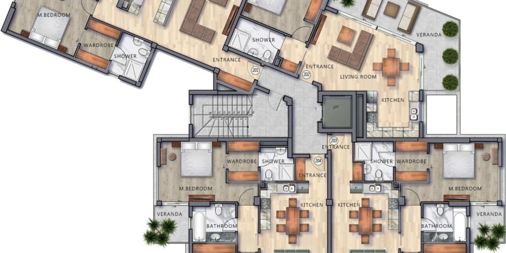 - The third floor comprises three penthouses, each with access to a private roof garden, along with an additional one-bedroom unit.