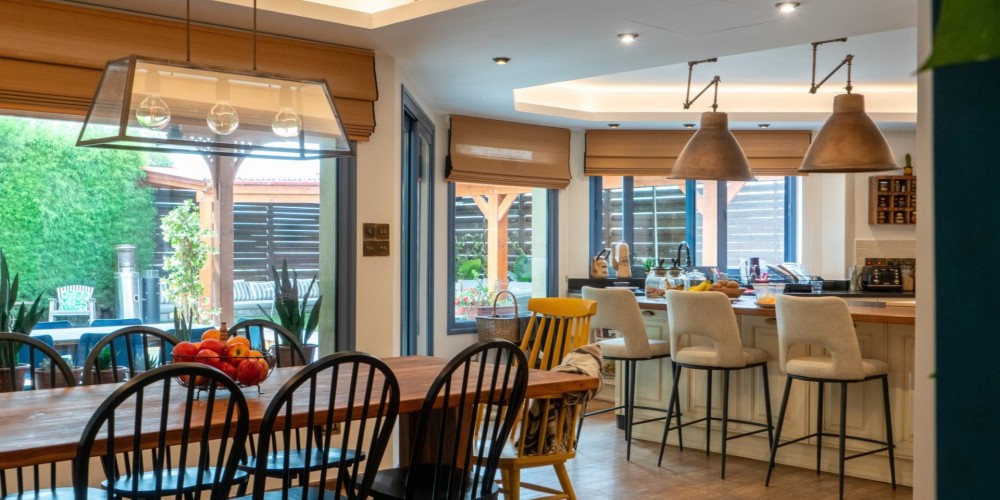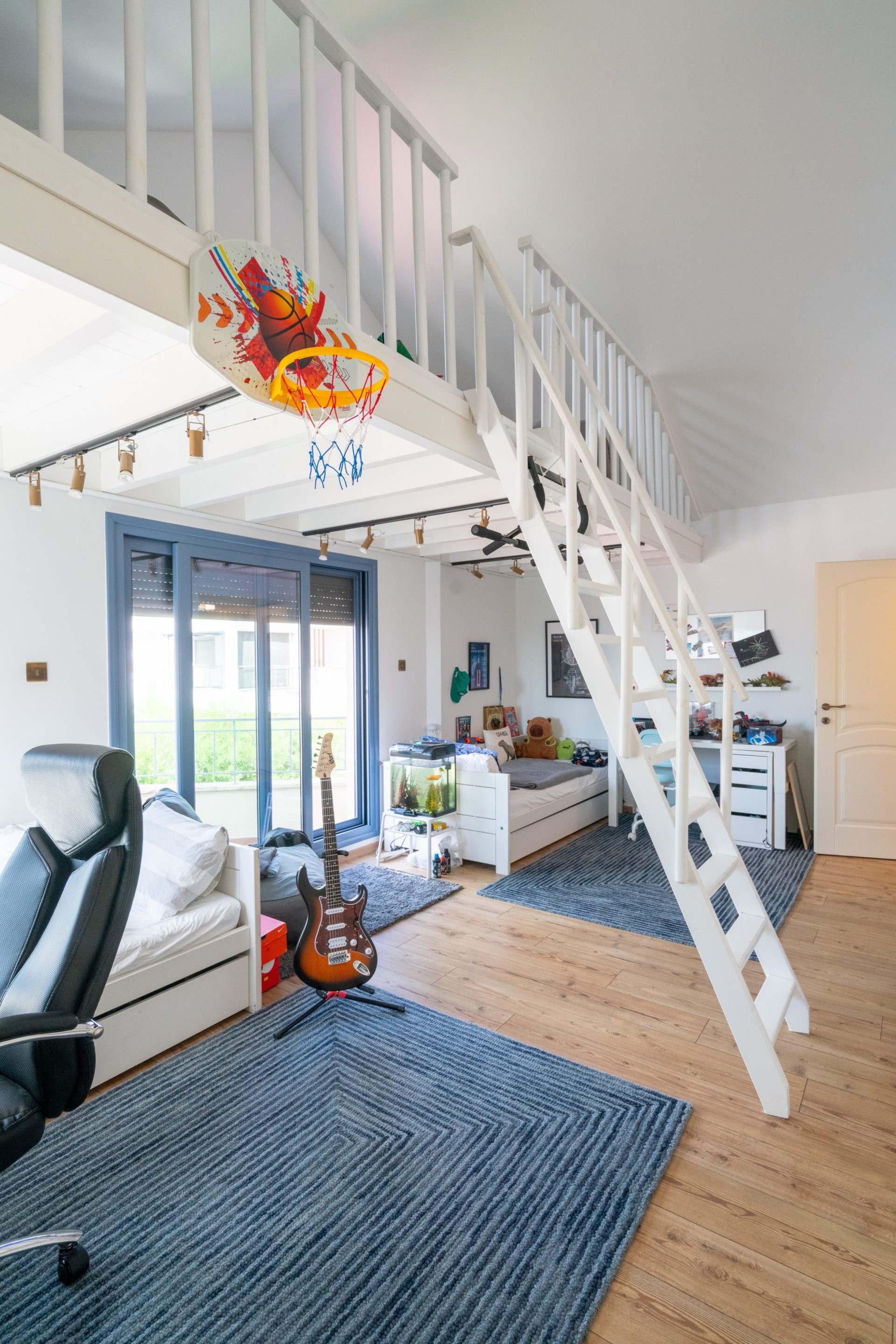 The villa features four large bedrooms, two of which include mezzanine lofts, a master suite with en-suite bathroom and walk-in wardrobe, and an additional en-suite room in the basement. The living spaces include an office, a playroom, and a bright living area with a fireplace. Outdoors, residents can enjoy an expansive garden with a private swimming pool, covered pergolas, and a seating area for relaxation.