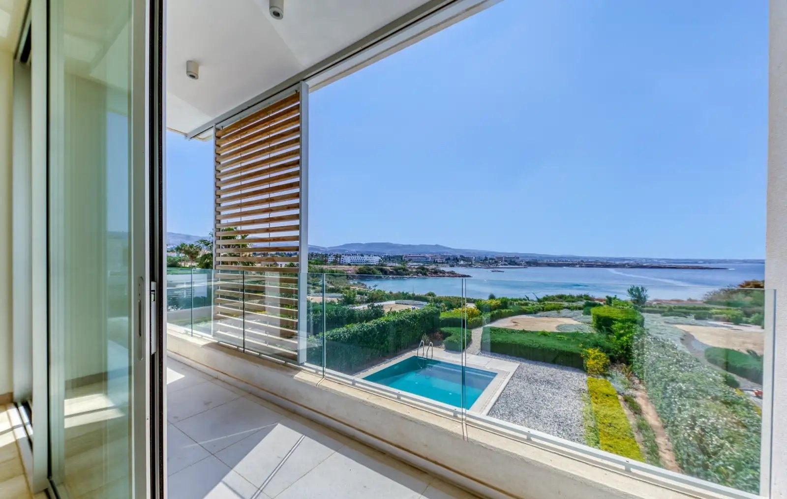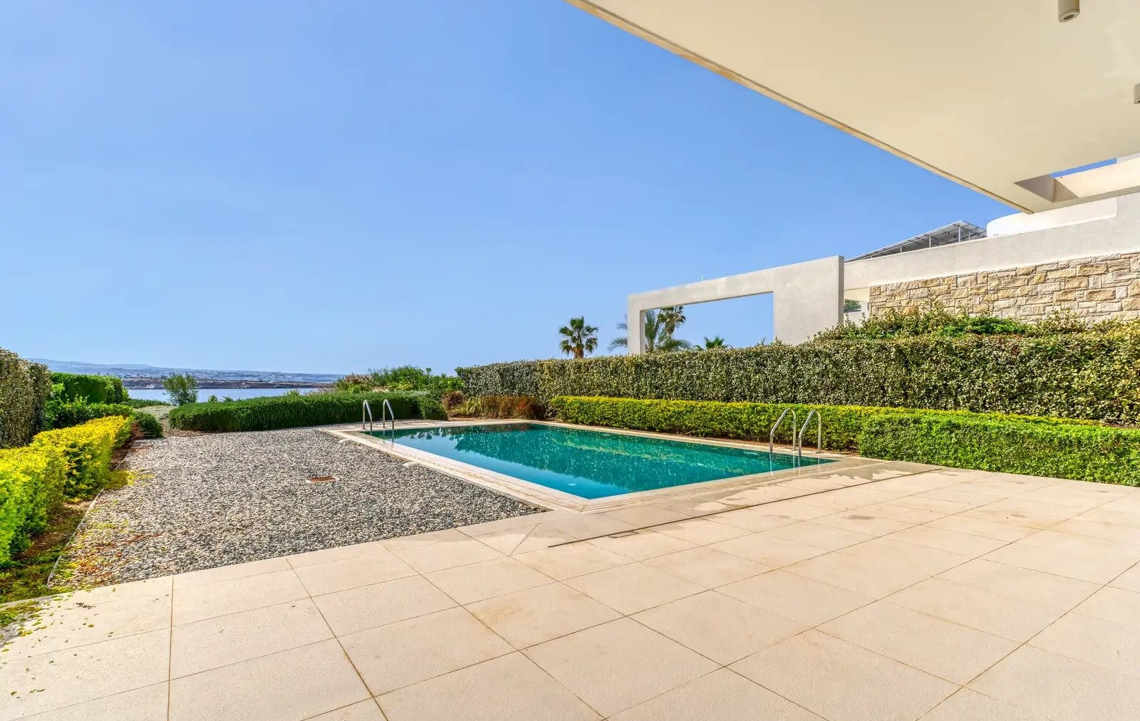 This luxury villa is located in Pegeia, within walking distance of the Coral Beach Hotel & Resort and close to the Akamas Nature Reserve. The residence features five bedrooms and five bathrooms, designed in a contemporary architectural style with high-end finishes. It includes a private swimming pool, landscaped gardens, underfloor heating, air conditioning, and large verandas. Residents also have access to a community gym and sauna.