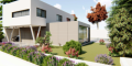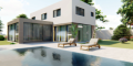 Villa in Palodia Village offers four bedrooms and three bathrooms, designed for comfortable modern living. The property includes a private swimming pool, landscaped surroundings, and parking with entrance gates. High-quality finishes feature aluminum series 3000 PLUS, granite countertops, and electric shutters. Additional provisions include air conditioning, home security alarm, intercom with camera, photovoltaic panels, and wall panel electric heater setup.