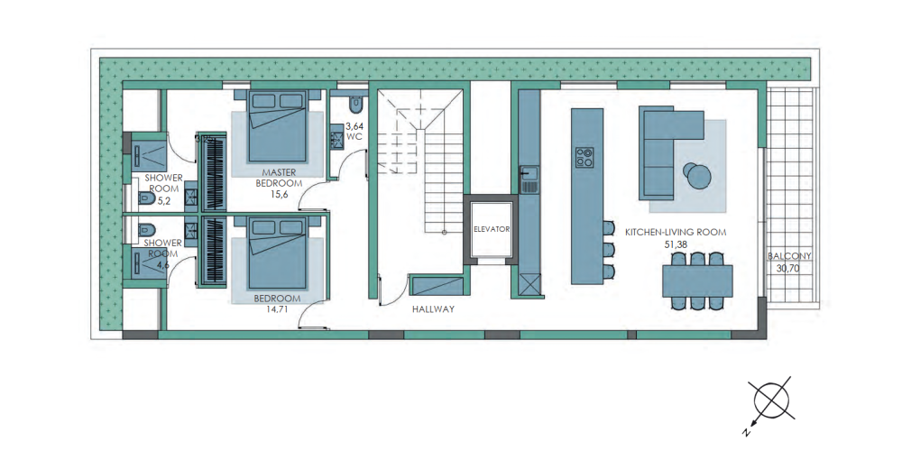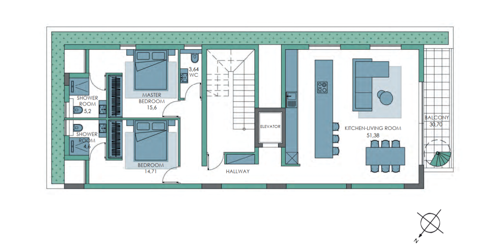 The interiors feature high-quality materials such as natural wood and stone, complemented by soft lighting and neutral tones to create a calm, welcoming atmosphere. Bedrooms are thoughtfully positioned to ensure privacy and comfort, while balconies and rooftop terraces offer the ideal setting for relaxing mornings or peaceful evenings with views of the city and the sea.
