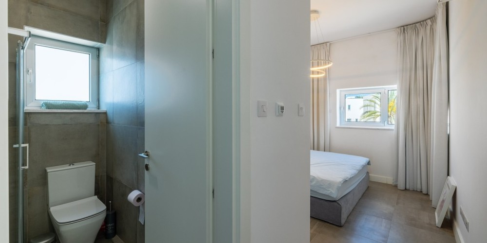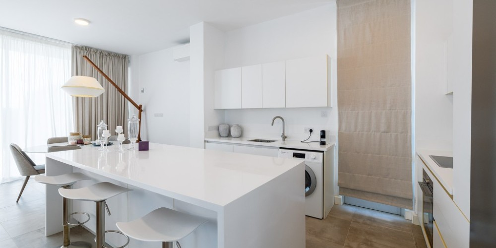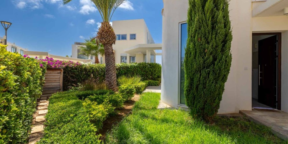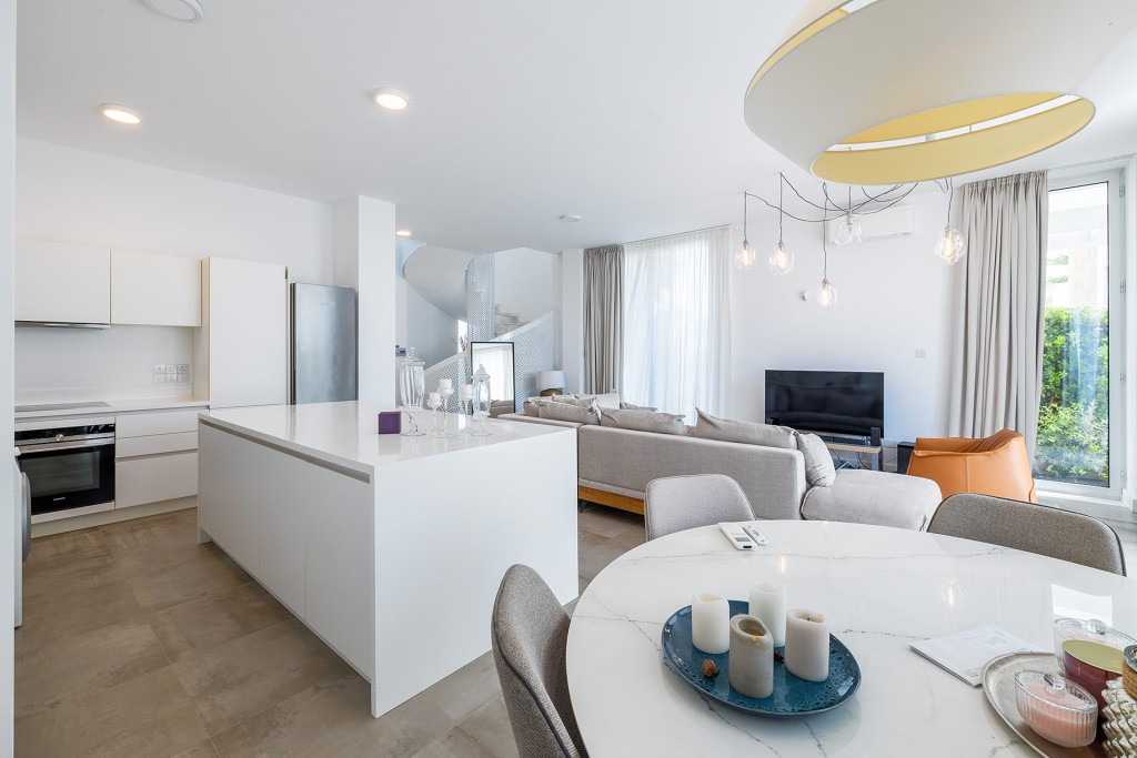 The surroundings include landscaped gardens, spacious verandas and patios, as well as access to gym and sauna facilities that enhance the Mediterranean living experience.