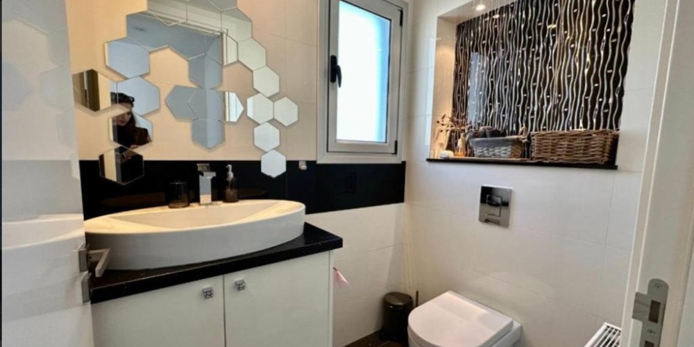 The basement provides two covered parking spaces, a WC, a small kitchen, a bedroom, and extra storage. Outdoors, the property includes two uncovered parking spaces, a 5×10 overflow swimming pool with eight jets for hydromassage, a BBQ area, and a garden. Additional features such as petrol heating, air conditioning units in all rooms, and a water softener system ensure comfort throughout the year.
