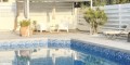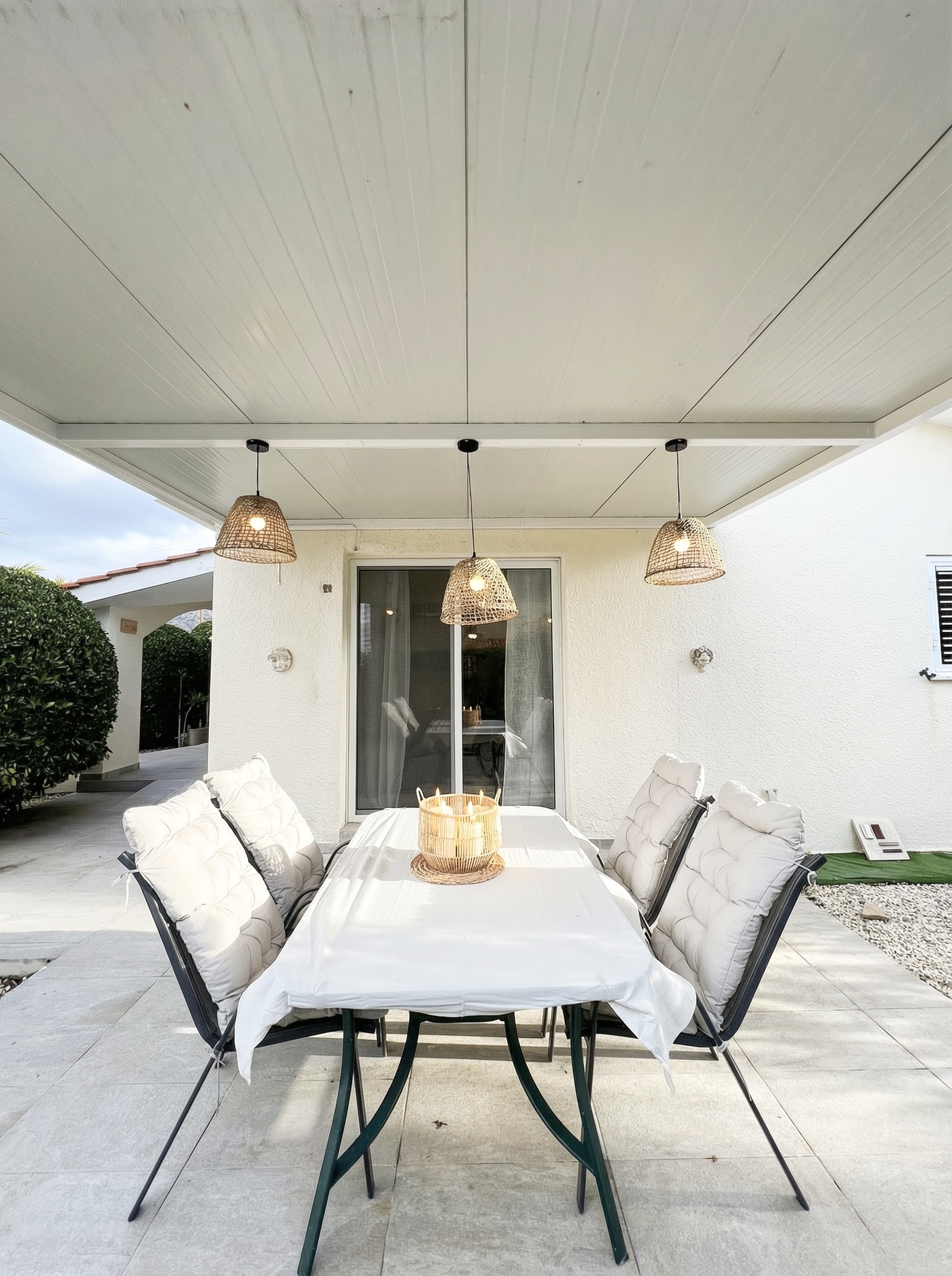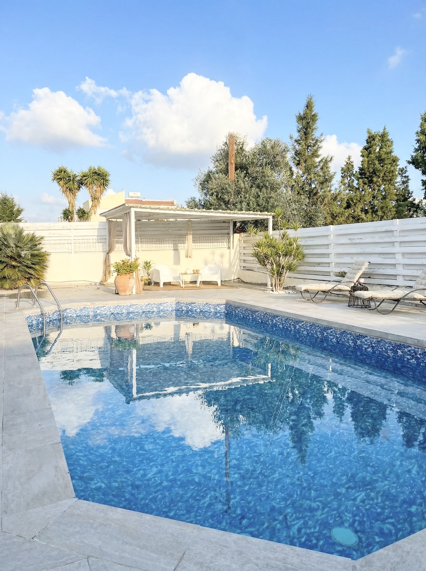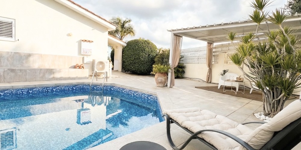 Outdoor spaces are designed for relaxation and leisure and include a private swimming pool measuring 8 × 4 metres, two covered pergolas, and a total of 24 sqm of covered verandas at the front and rear of the house. The property also features a fully equipped kitchen, furniture included, and covered parking.