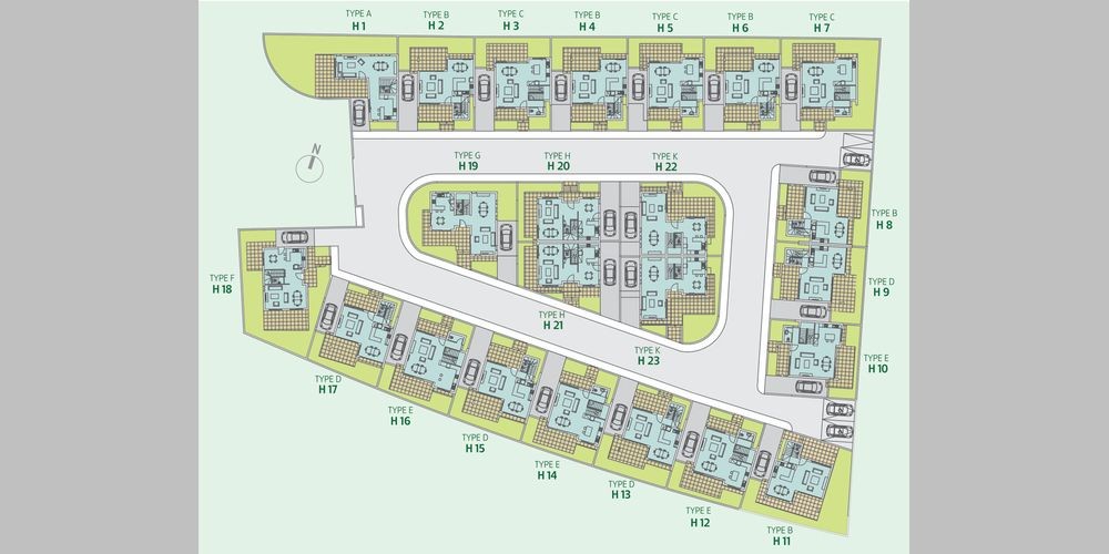 All the houses have three bedrooms. Sitting rooms open to both front and rear yards. Dining areas face patios. In addition to a large common bathroom there is an en suite bathroom with a shower in the master bedroom. The majority of bedrooms have balconies. All the houses have completely covered parking places.