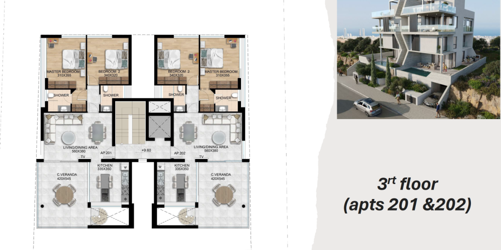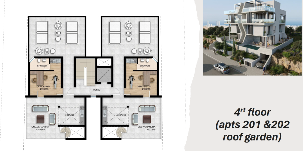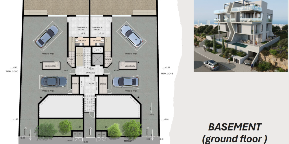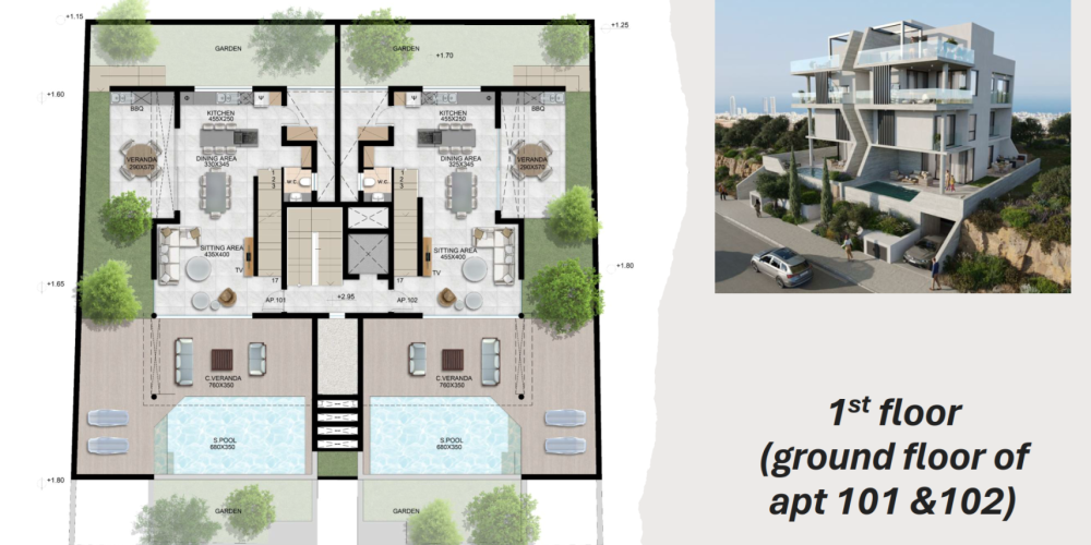 This residential project features two-level apartments with thoughtfully designed layouts, where selected units include private swimming pools, while others offer spacious roof terraces. Each apartment benefits from its own private garden, enhancing comfort, privacy, and everyday living.