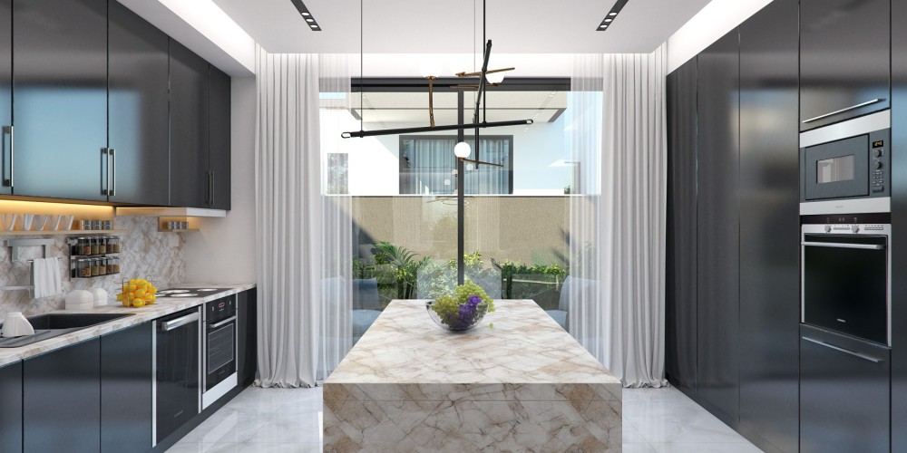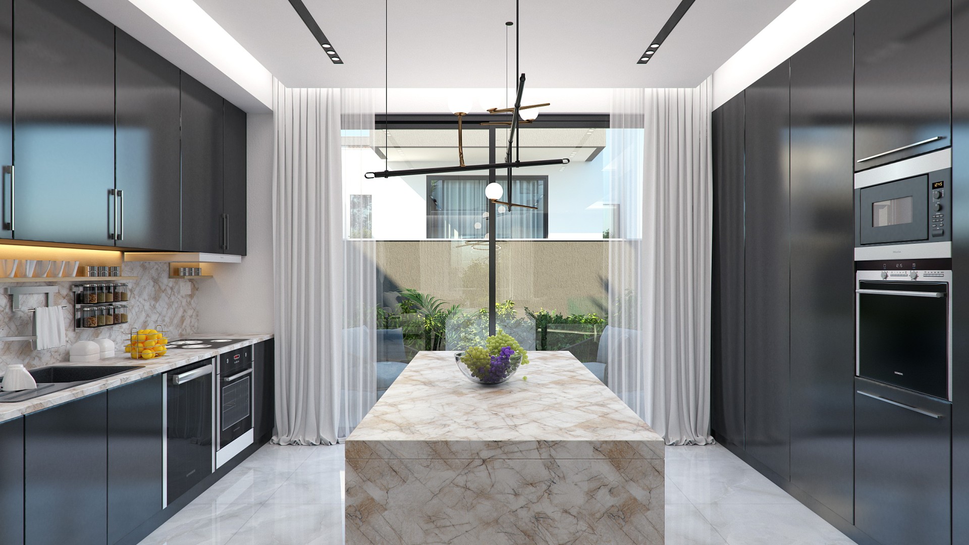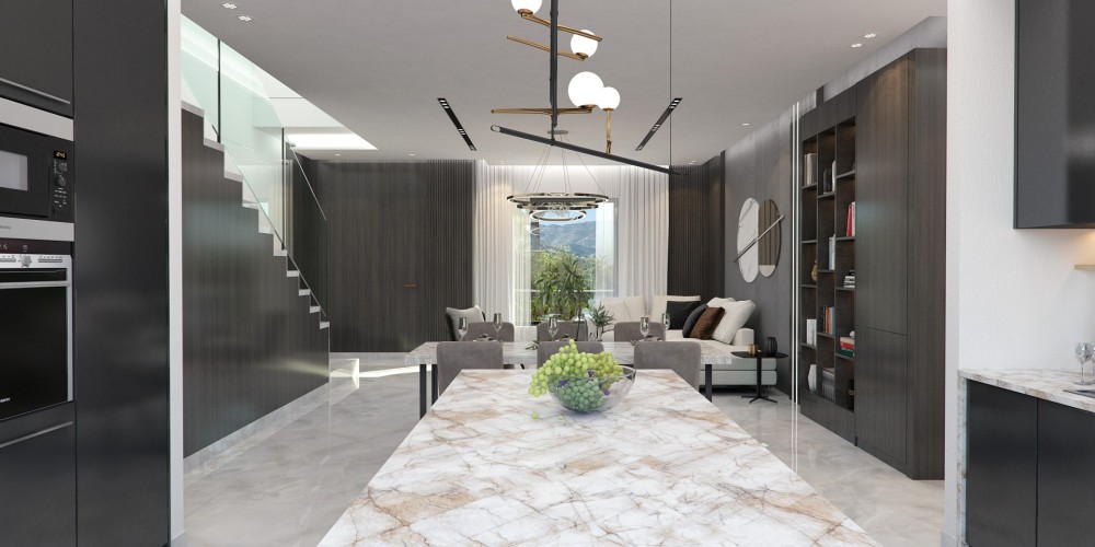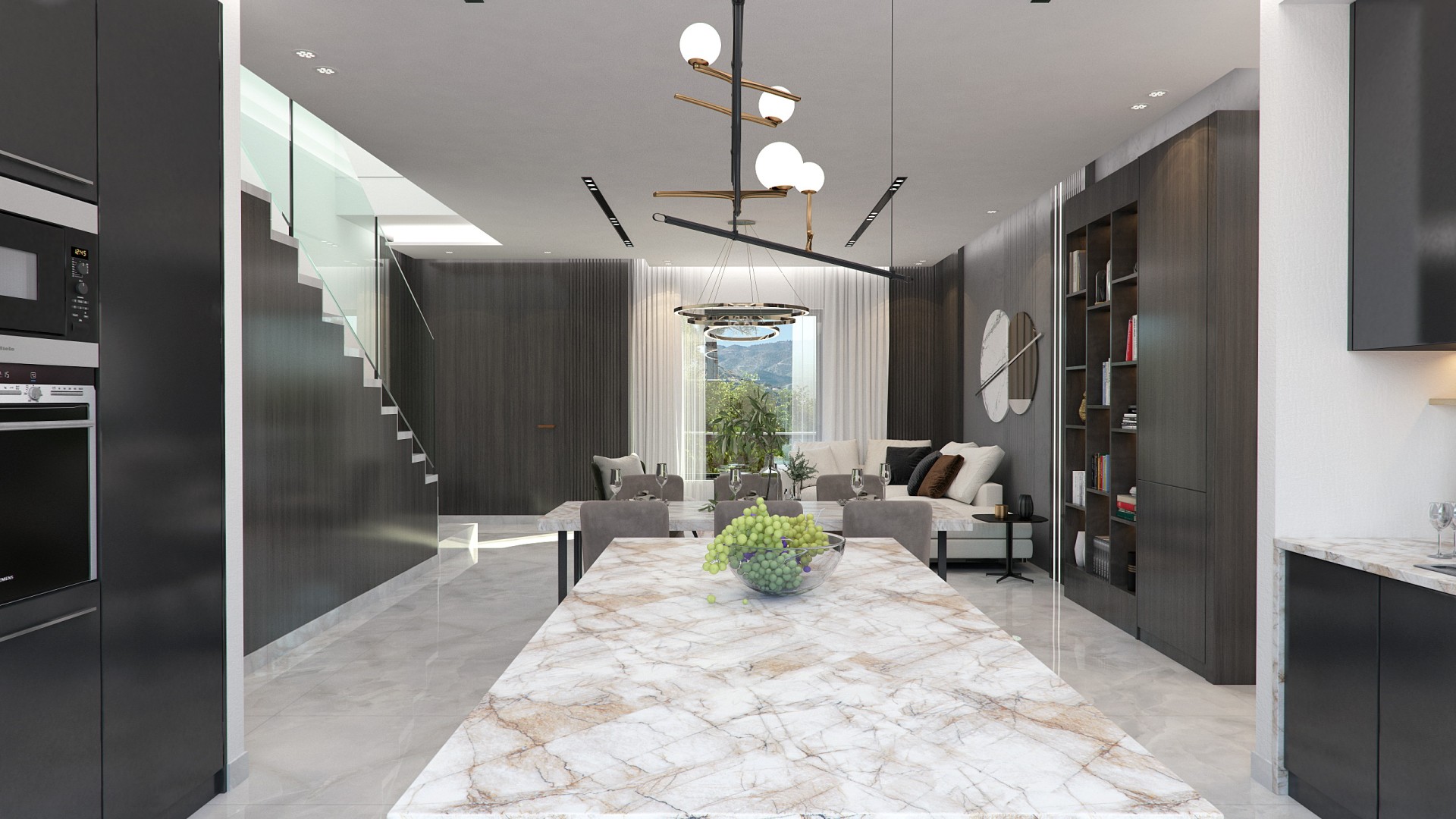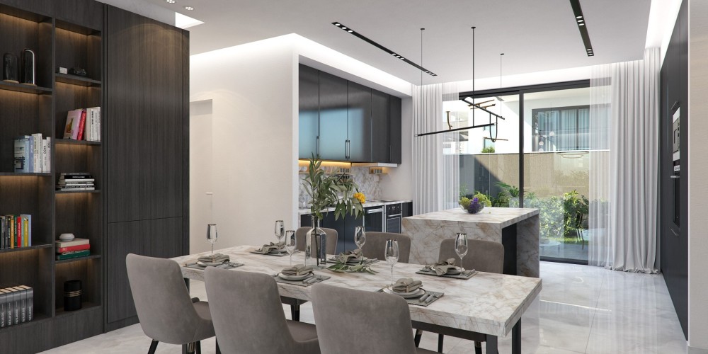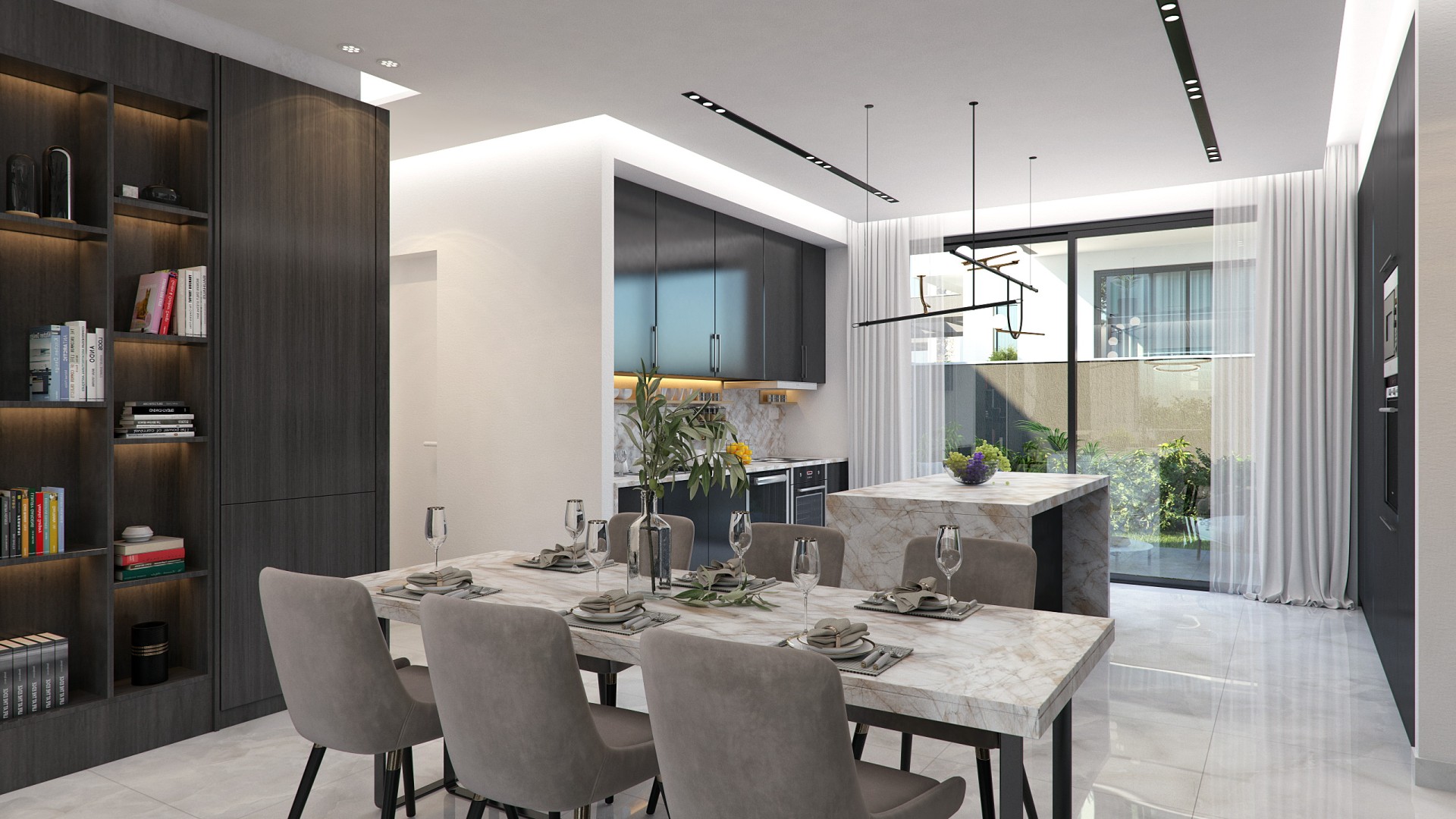 Each property features a functional open-plan layout that combines the kitchen, living, and dining areas, enhanced by an island bar that adds both convenience and a social focal point. The residences include three well-proportioned bedrooms, one of which is a master bedroom with a private en-suite bathroom. Outdoor space is provided through a private garden, ideal for everyday relaxation.
