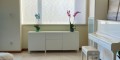 The apartment features a spacious open-plan living and dining area with a contemporary fully fitted kitchen, designed to maximise natural light and the outlook towards the sea. A discreet integrated climate control system provides comfortable conditions throughout the year. The property includes two bathrooms and is located on the second floor of the building.