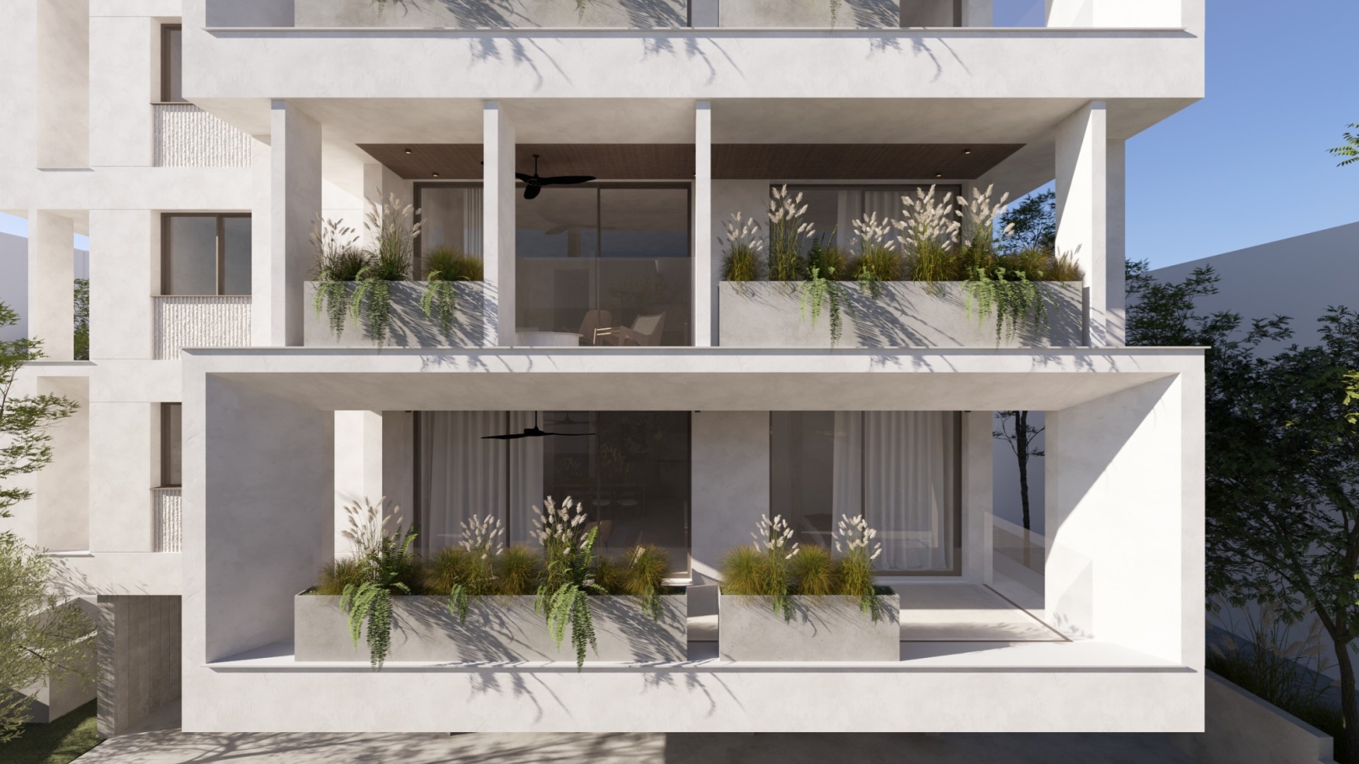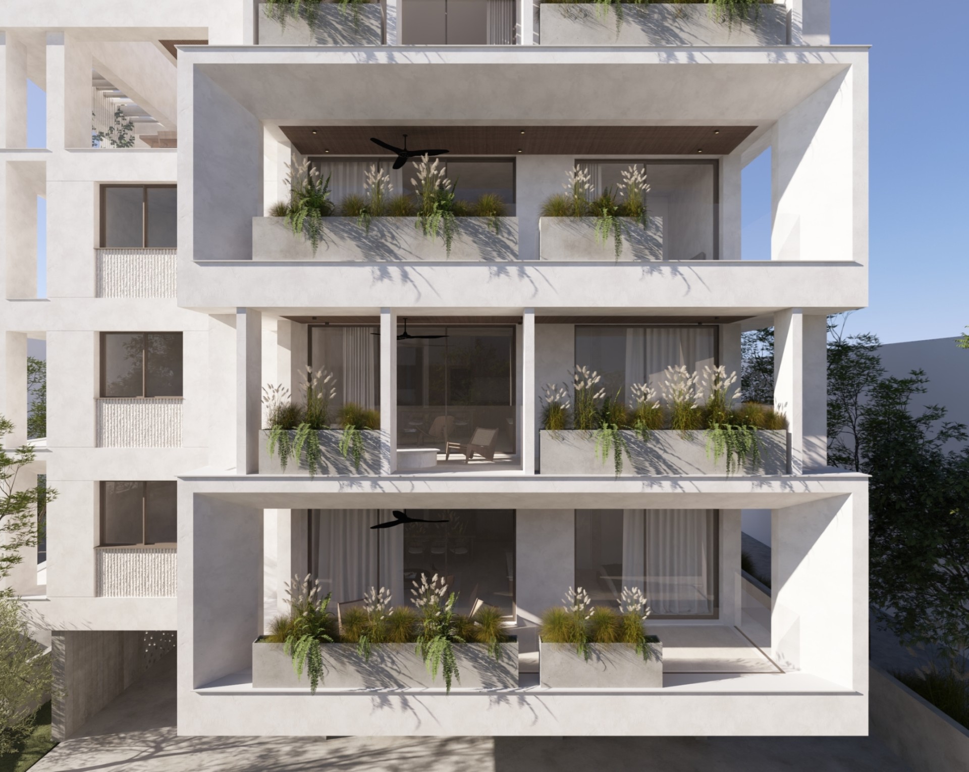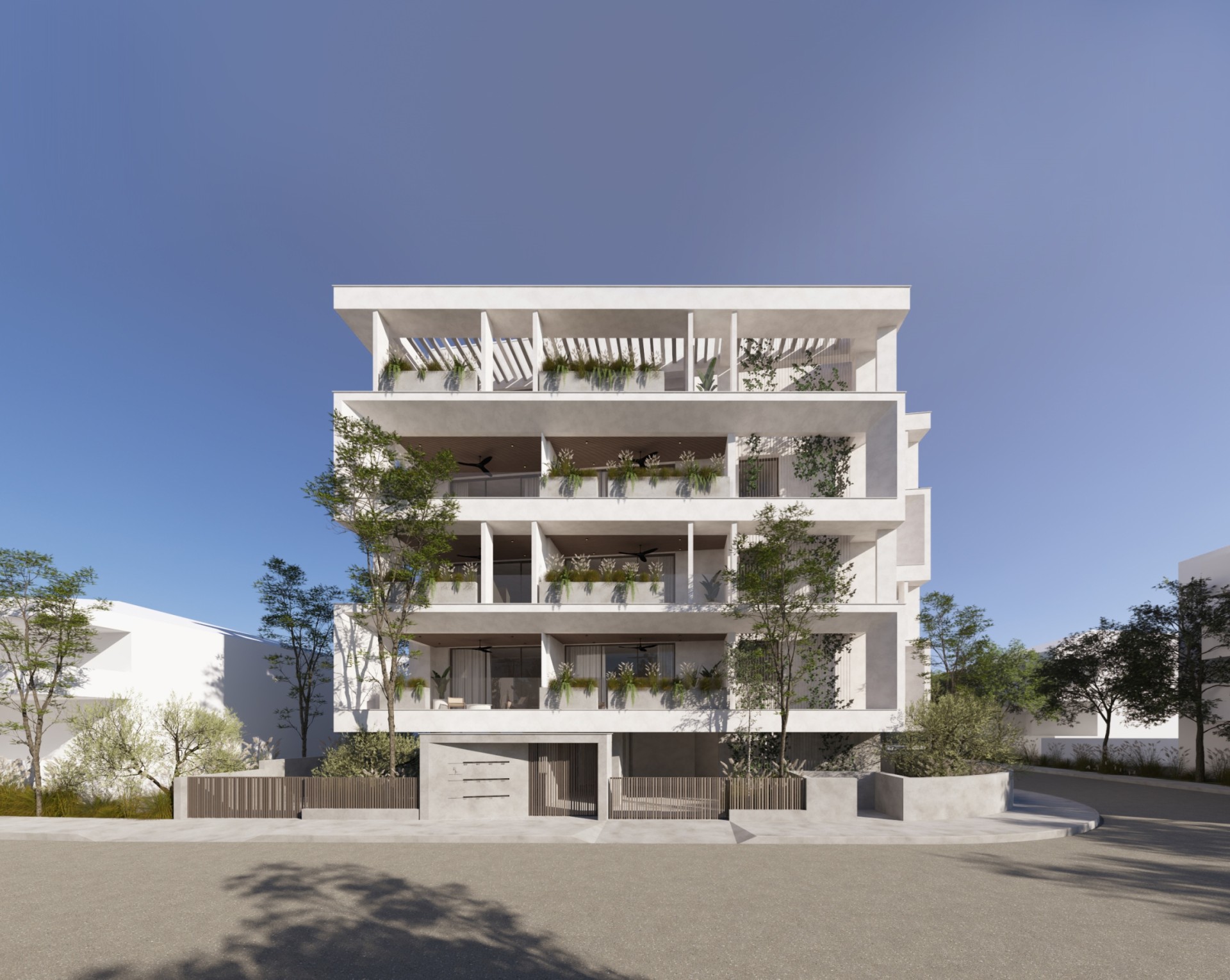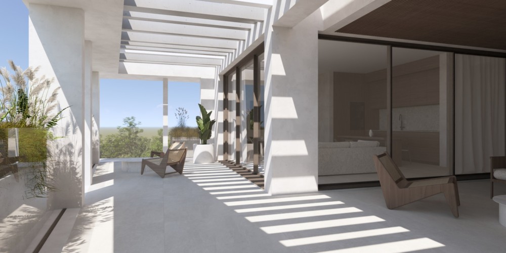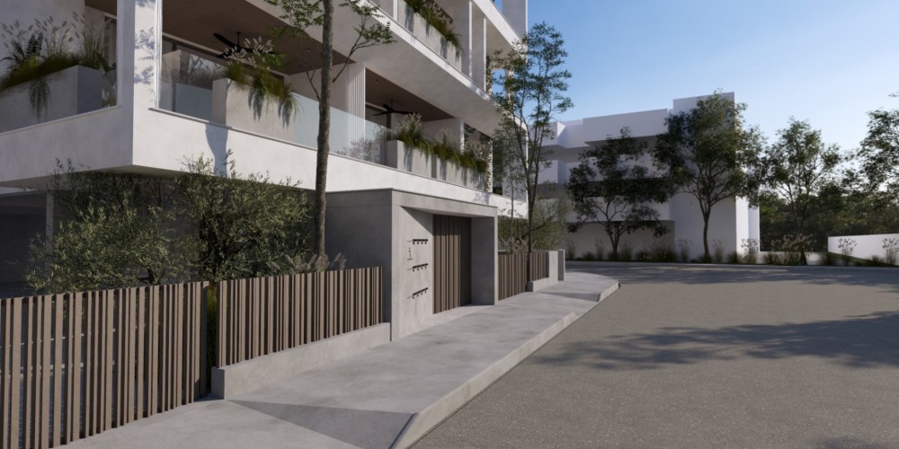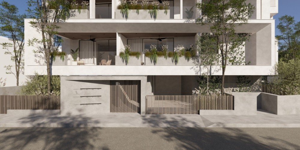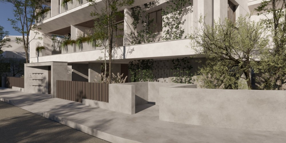 The project consists of a modern four-storey residential building with a total of eleven apartments. The residences are designed with a practical layout that maximises the use of space and provides comfortable interiors for daily living. Each apartment includes two bedrooms and two bathrooms, as well as spacious covered verandas that extend the living area outdoors.