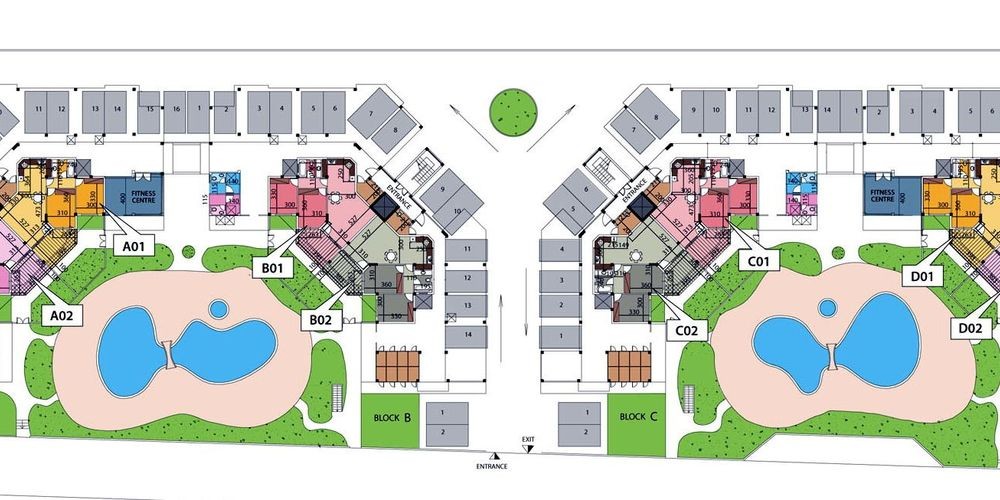 Property complex comprises apartments in 4 three-storey blocks circling 2 large swimming pools.