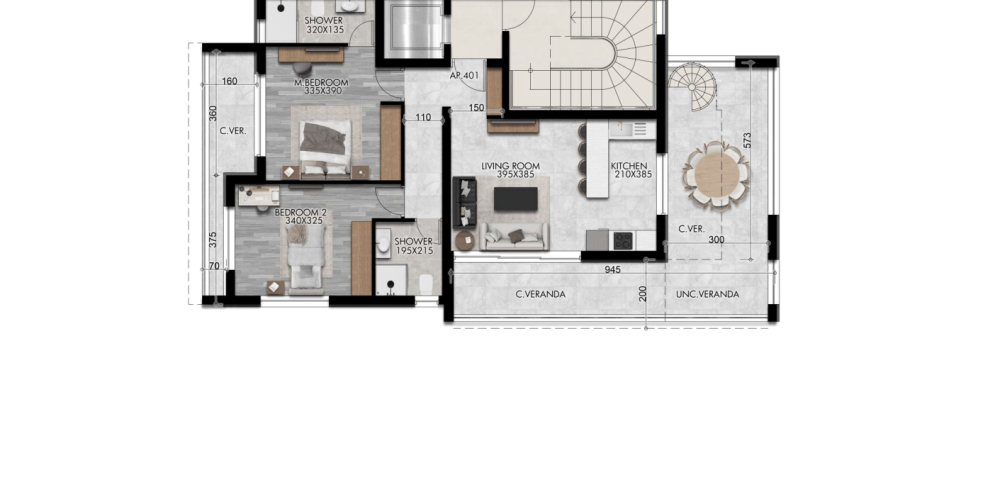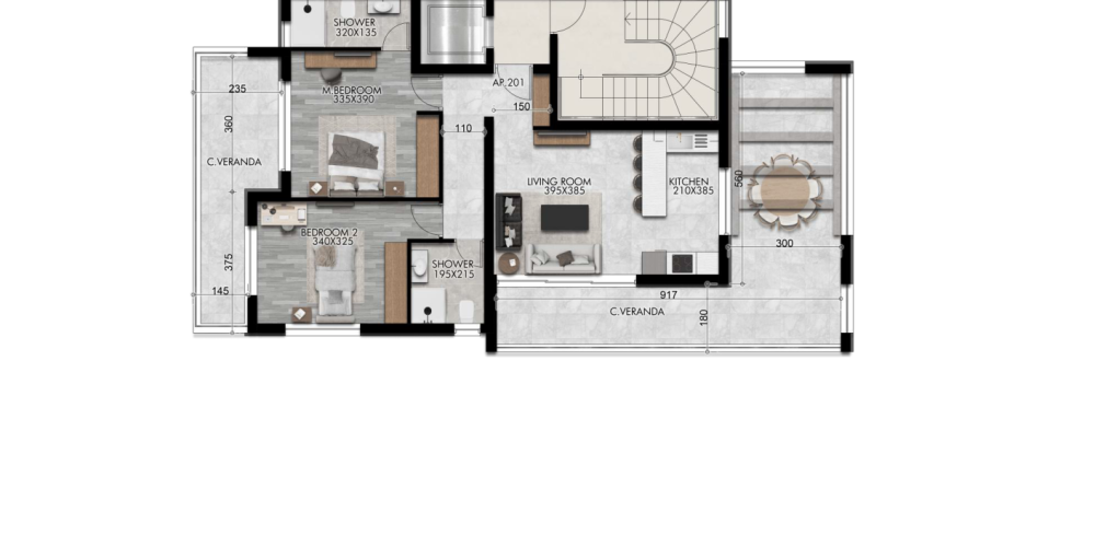 - 2nd and 3rd floor units: internal area 80 m², covered verandas 28–29 m²