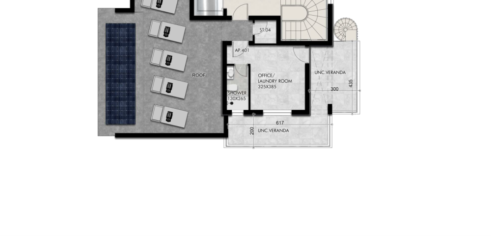 - 4th floor penthouse: internal area 80 m² + 26 m² rooftop garden, covered and uncovered terraces, office/laundry room, shower room