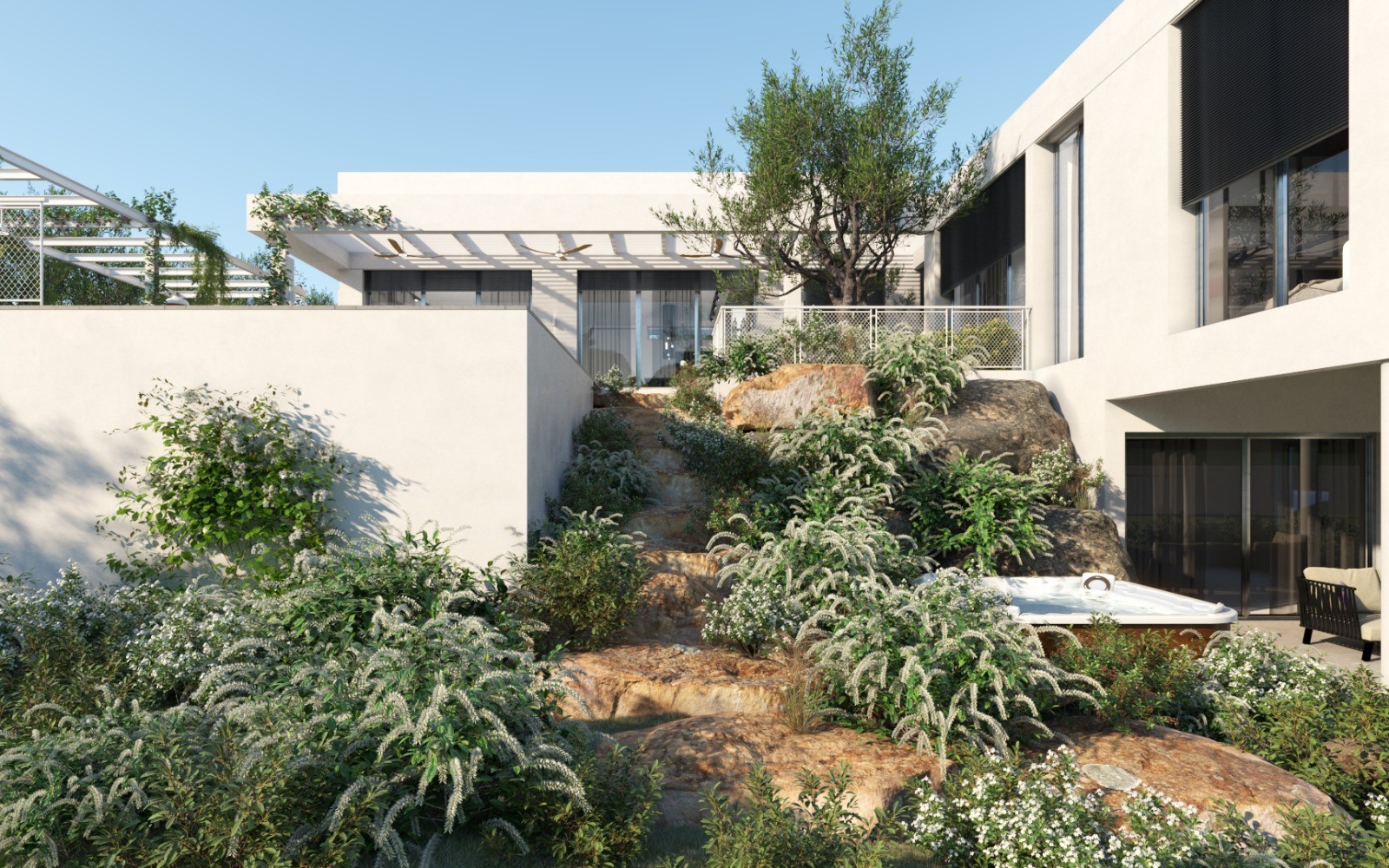 Every residence comes with its own private overflow/infinity swimming pool (approx. 3.5 × 8 m) finished in mosaic with underwater LED lighting, spacious terrace lounges, and a landscaped garden. Two covered parking spaces are included with each villa, set on plots ranging from 493 to 781 m².