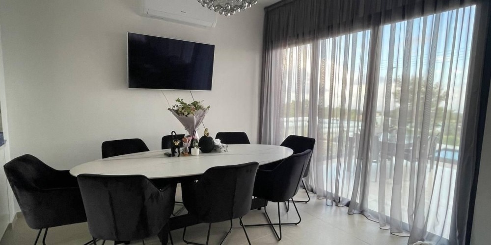 Surrounded by pine forests and open skies, this five-bedroom villa in Souni captures the quiet beauty of the Cypriot landscape. Built in 2022, the villa combines sleek modern architecture with a deep respect for its natural surroundings. Spacious interiors flow effortlessly from room to room, illuminated by soft natural light and framed by panoramic views of the sea. Every detail has been thoughtfully considered: underfloor heating runs throughout the home for year-round comfort, while a photovoltaic system supports sustainable living.