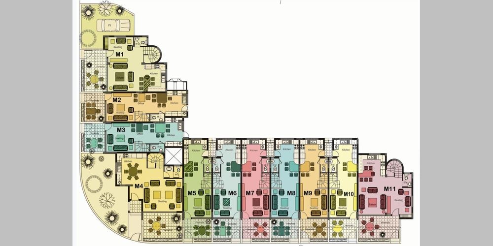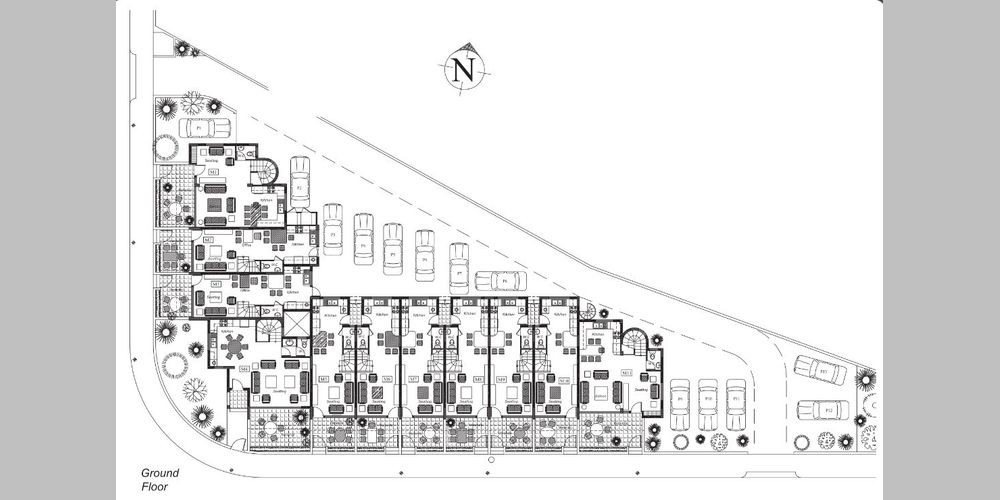 The project offers townhouses with spacious living areas and outdoor space, served by a communal swimming pool with changing rooms and covered parking space.