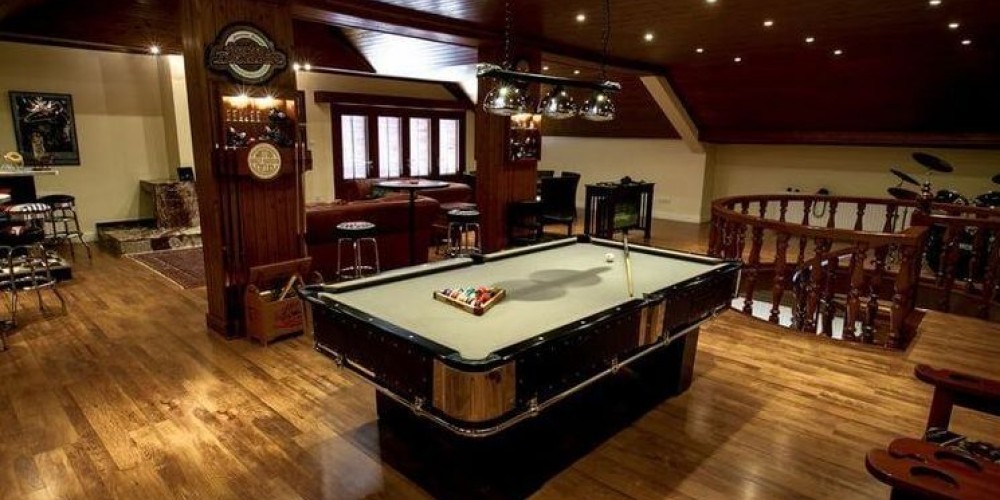 - harley-davidson pool table with high sofa and high chair