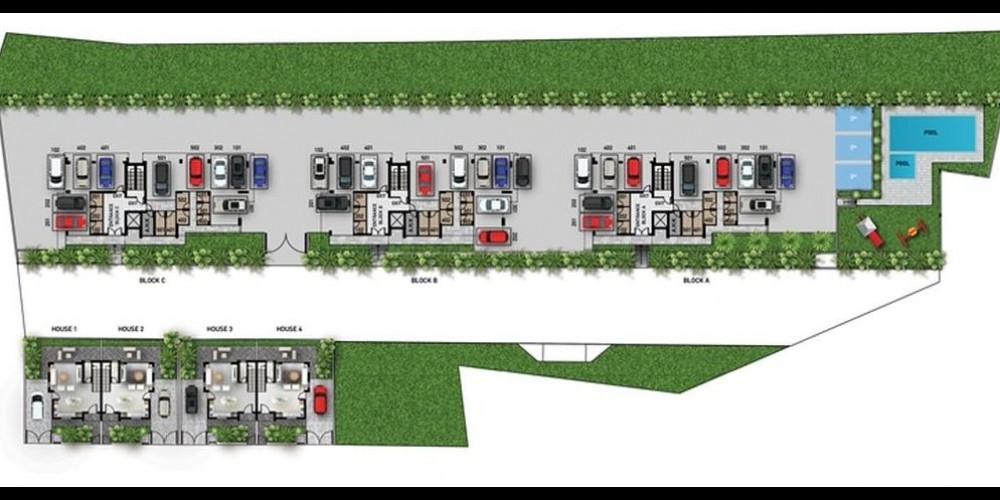 This complex is in a quiet tourist area and has a modern architecture, fresh design. The complex consists of 2 and 3 bedroom apartments and four semidetached 2 bedroom houses. The complex offers privacy, security and convenience. The beach is only 600 meters from the buildings, all the amenities are within a short walking distance. The complex will have a communal swimming pool and a gated children’s playground.