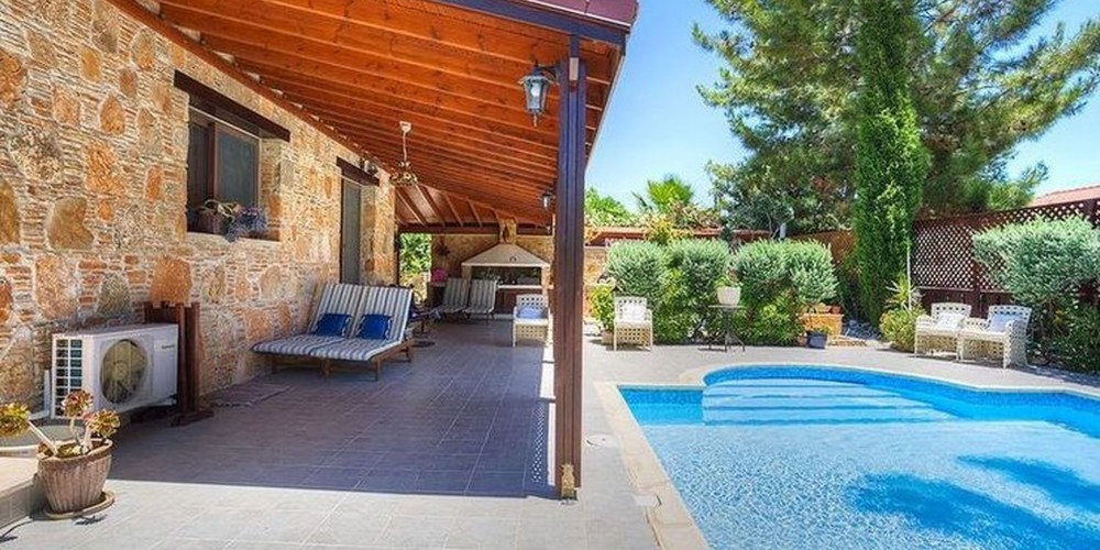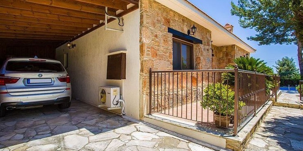 This three bedroom detached villa with a natural stone façade is located in a picturesque pine forest village of Souni, some 20 minutes drive to the north west of Limassol, 10 minutes to the popular Curium beach and 25 minutes to the private heritage school. On the ground floor there is an open plan living area and kitchen and two en-suite bedrooms. The main bedroom is on the first floor with an en-suite bathroom with Jacuzzi and separate shower, there is also a large enclosed veranda area with views to the sea. The property also benefits from double glazing, central heating, fireplace, solar water heating and a water filter system. Outside there is a mature garden with an automatic irrigation system, fruit trees, a large private pool, sauna, BBQ, shed/utility room with water and electricity, pergola, covered and uncovered parking and automatic entry gates. Title deeds are available.