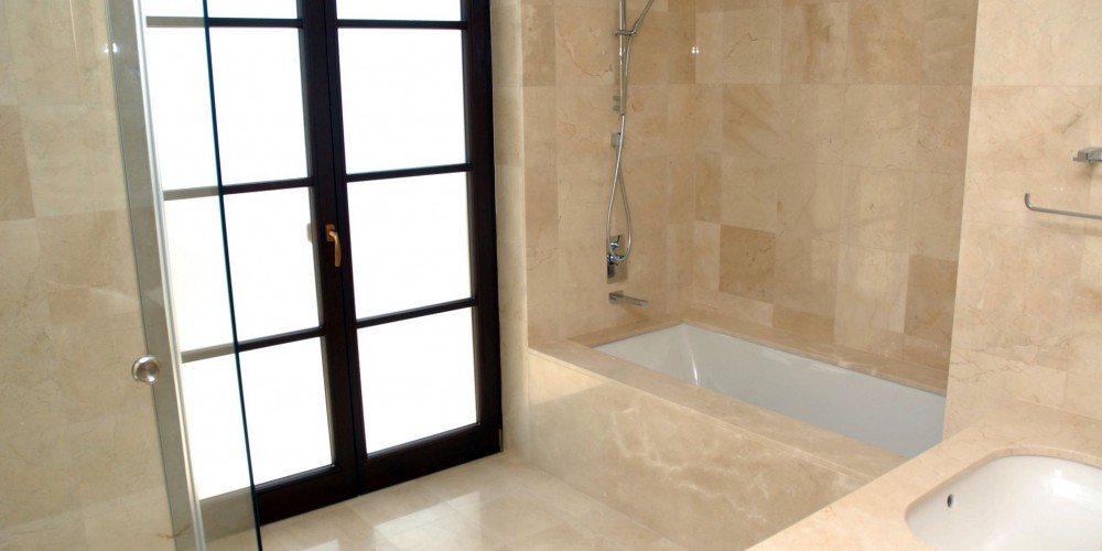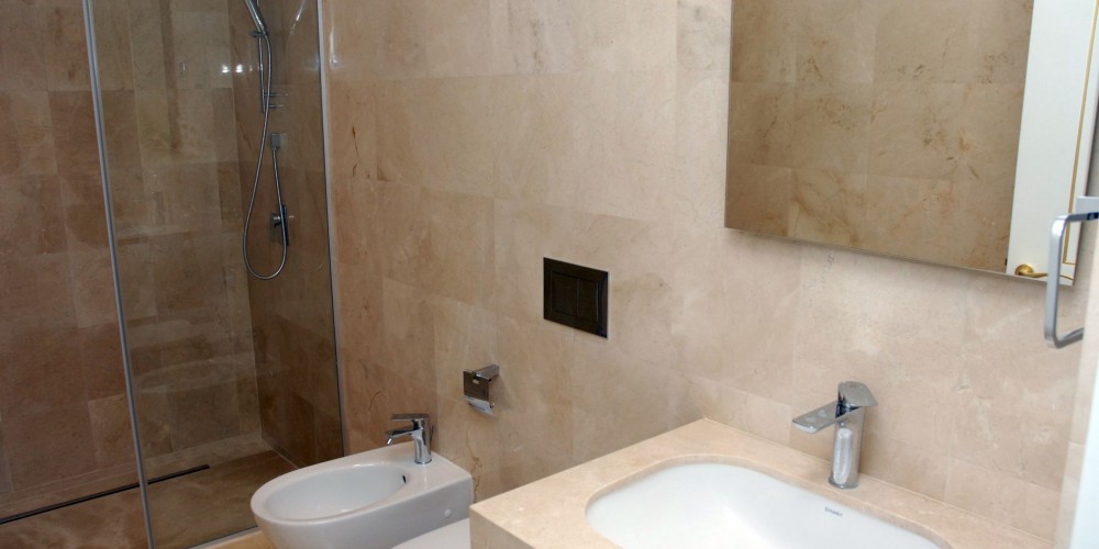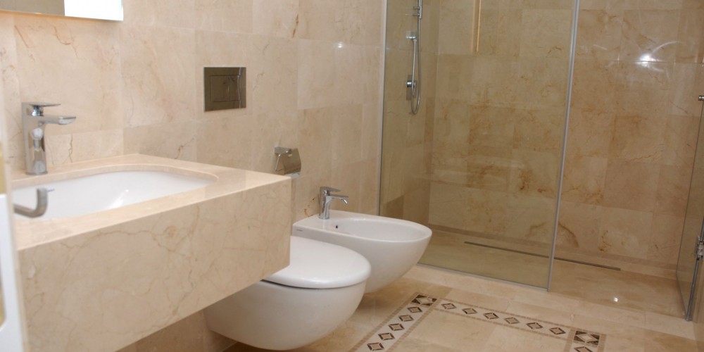- Bathroom floors and walls are laid with expensive sorts of marble and granites
