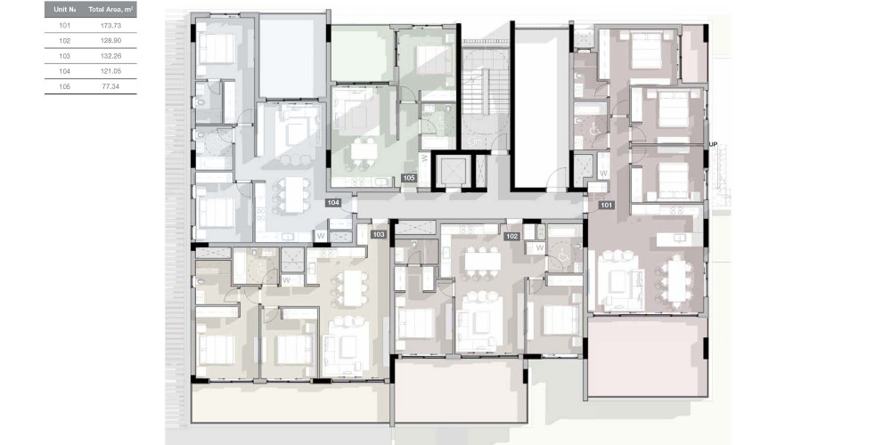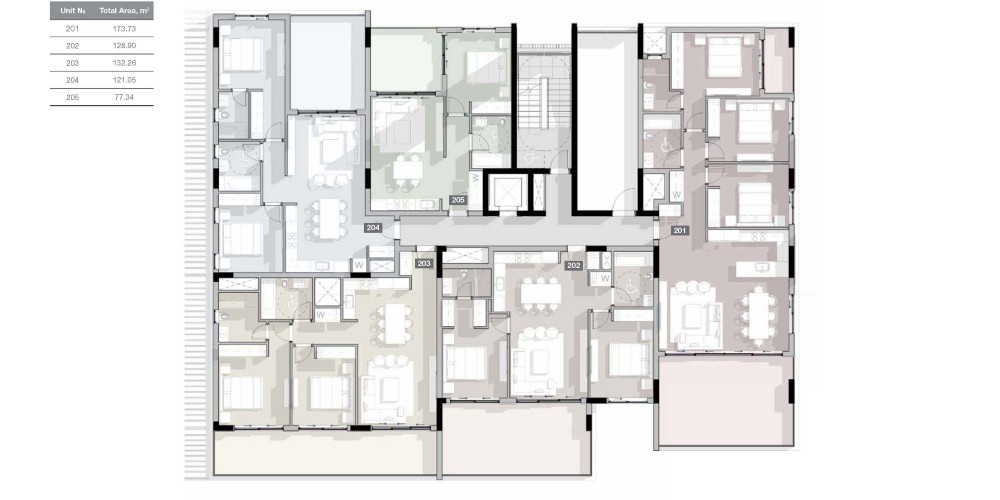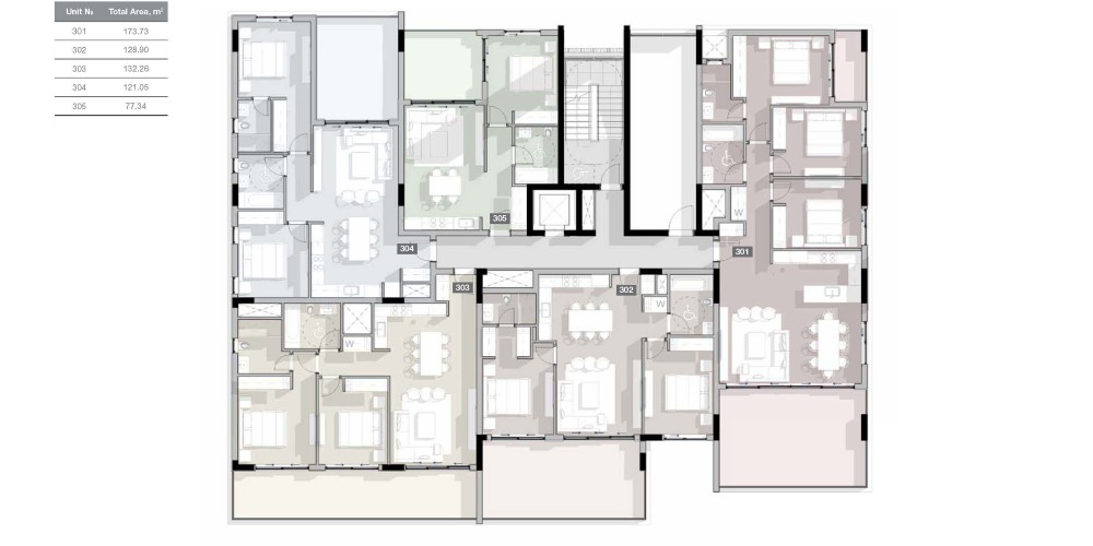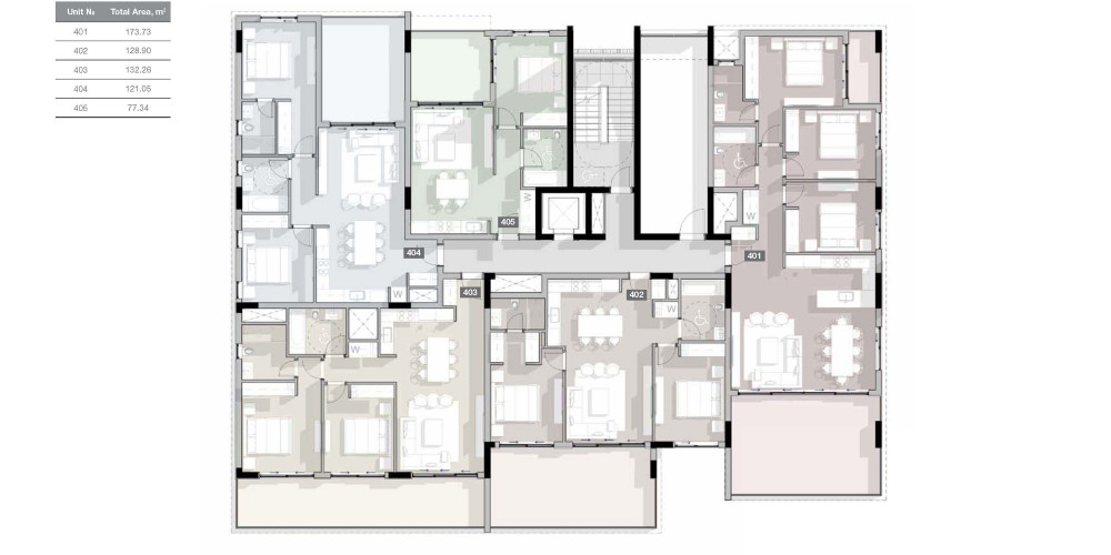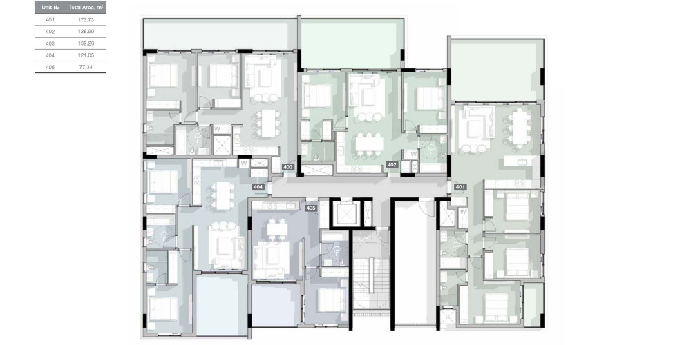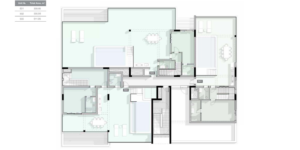 - Penthouses enjoy private roof terraces with pools