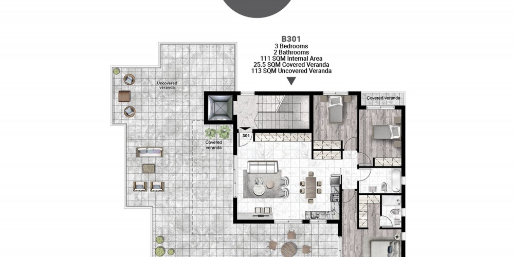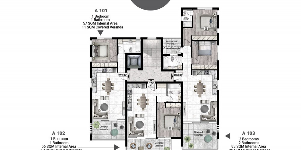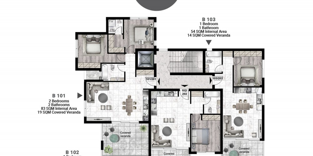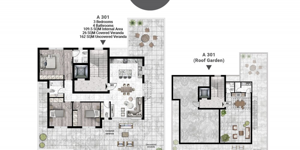 The development consists of 2 blocks and offers a variety of spacious 1 and 2 bedroom apartments along with 3-bedroom penthouses with large terraces.