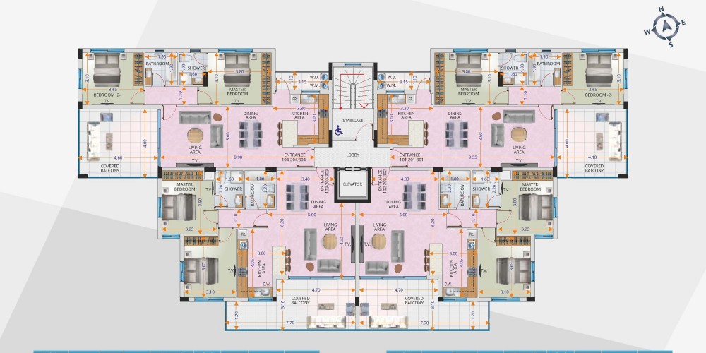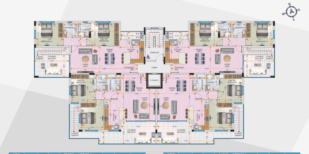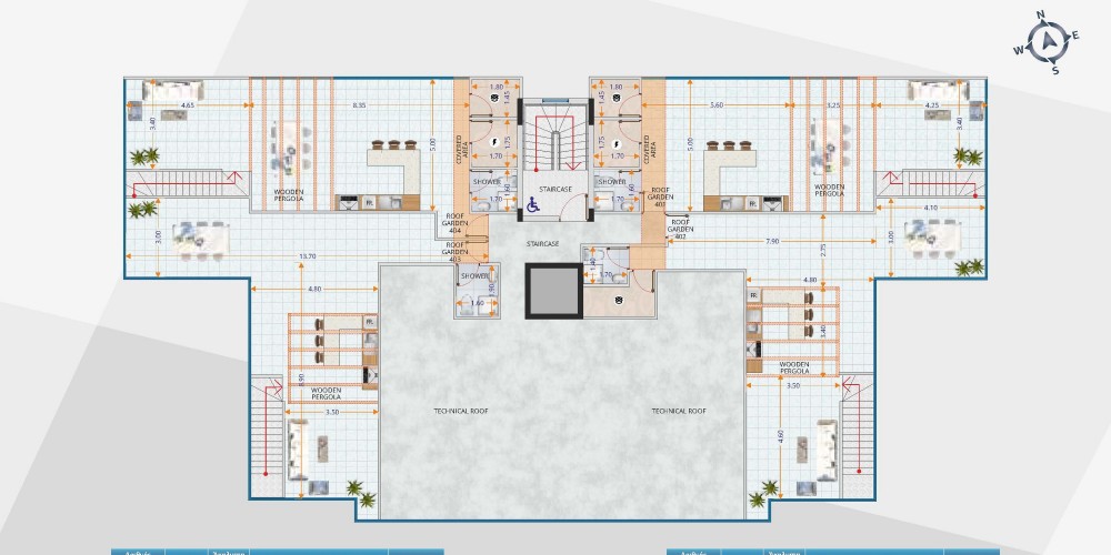 The project consists of two bedroom apartments with spacious living areas. The four fourth floor apartments benefit from individual private roof gardens with panoramic views. Each apartment will have one parking space and a storage room on the ground level.