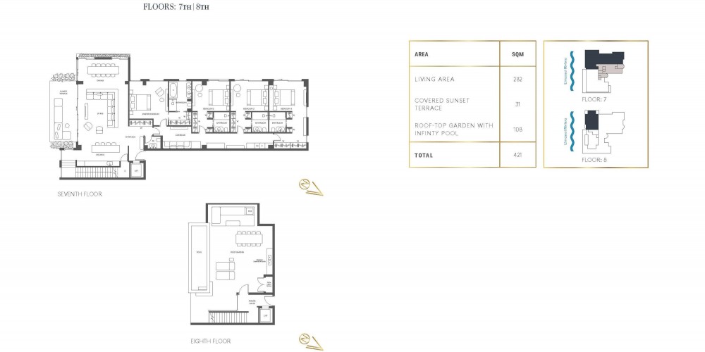Penthouse Collection is on the 7th floor with 2 duplex apartments and 4 bedrooms that include a roof terrace on the 8th floor.